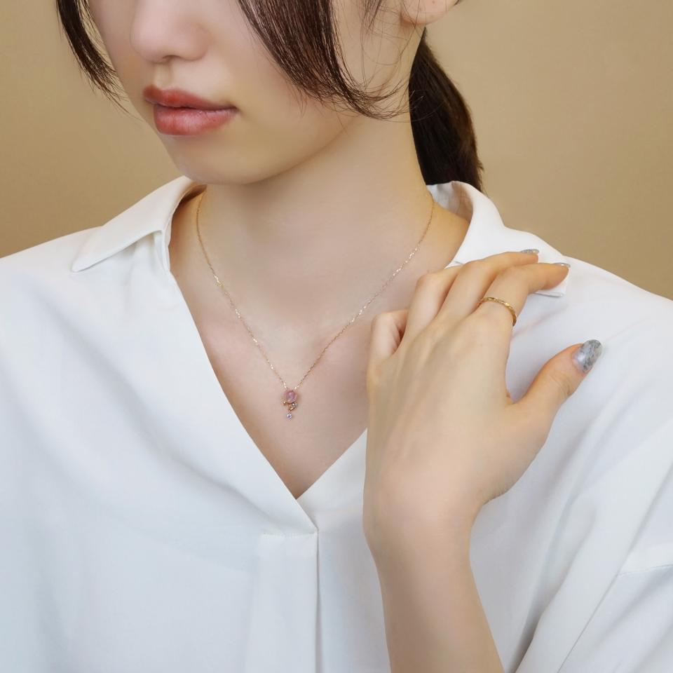 ピンクシェルのぽってりとした1輪のシクラメンが愛らしいネックレス。シクラメンの特徴的な花の形をオリジナルカットで表現しています。小さなつぼみや葉をピンクゴールド素材で細やかにデザインし、グリーンクォーツを色鮮やかな葉のように配しました。
