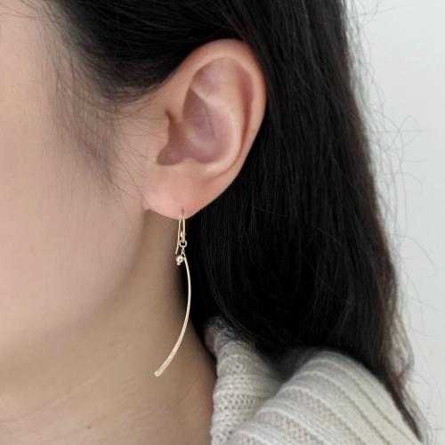 地金のワイヤーで緩やかなカーブを作り、下に向けて平たくつぶしたピアスチャームです。