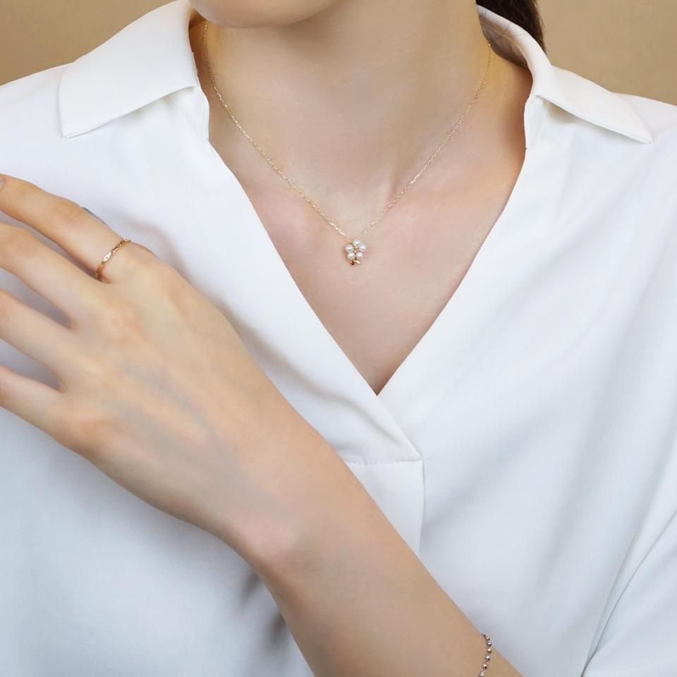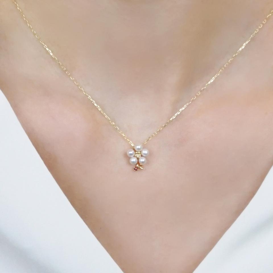 和テイストになりがちなウメのデザインを、パールの花びらにすることでフェミニンな印象に仕上げました。中心にポコポコと並んだ丸玉がおしべのように見えます。ふっくらとしたつぼみに見立てた1月の誕生石ガーネットがアクセントになっています。