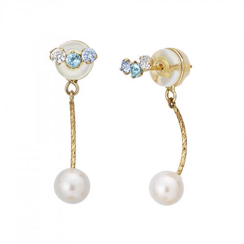 K10イエローゴールド、スイスブルートパーズ、キュービックジルコニア(クリア・グレイッシュブルー)、プラスチックパール( ポストとシリコン内のキャッチ部分のみK18イエローゴールド)