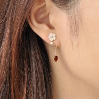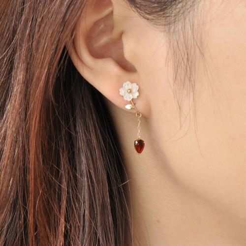 ガーネットのチャームを苺に見立て、大きなホワイトシェルの一輪のお花に合わせた可愛らしいイヤリングです。