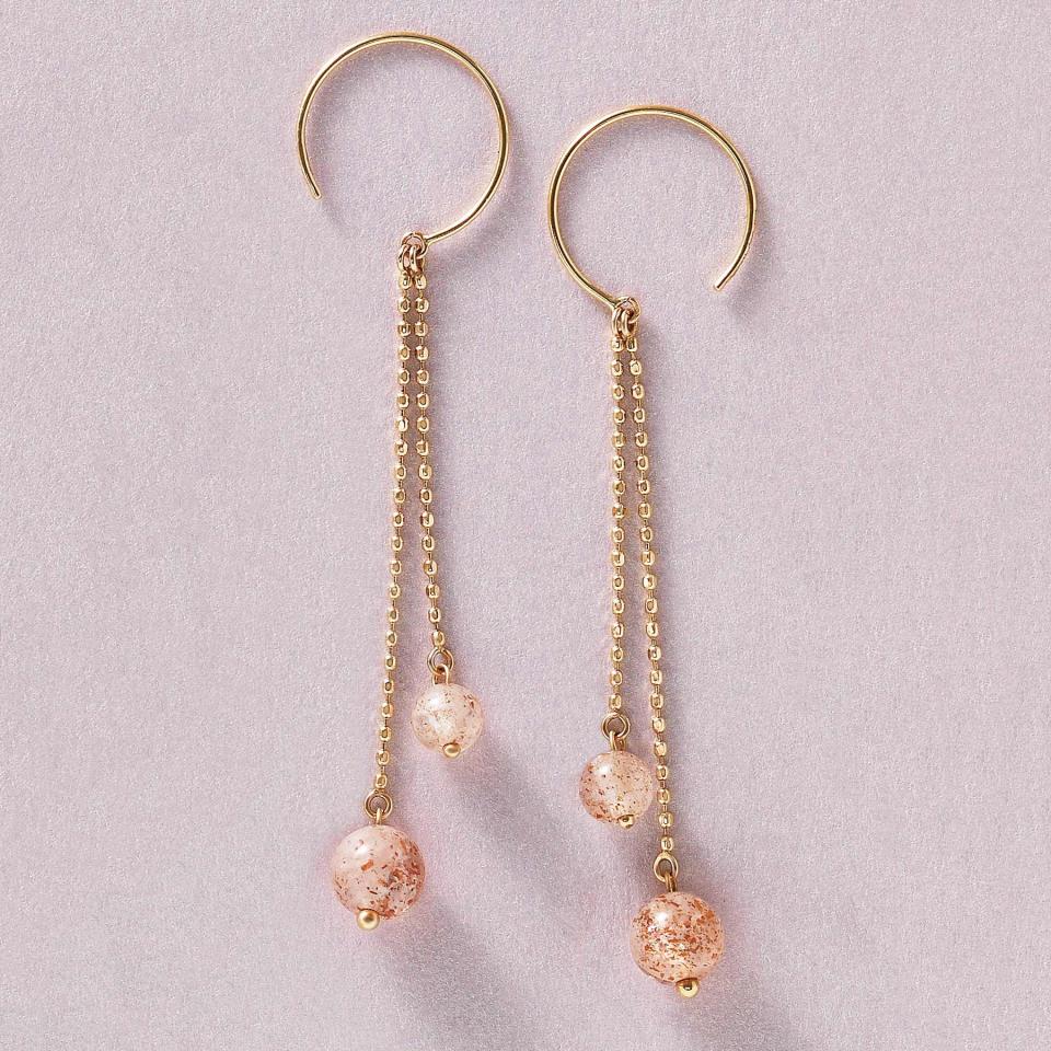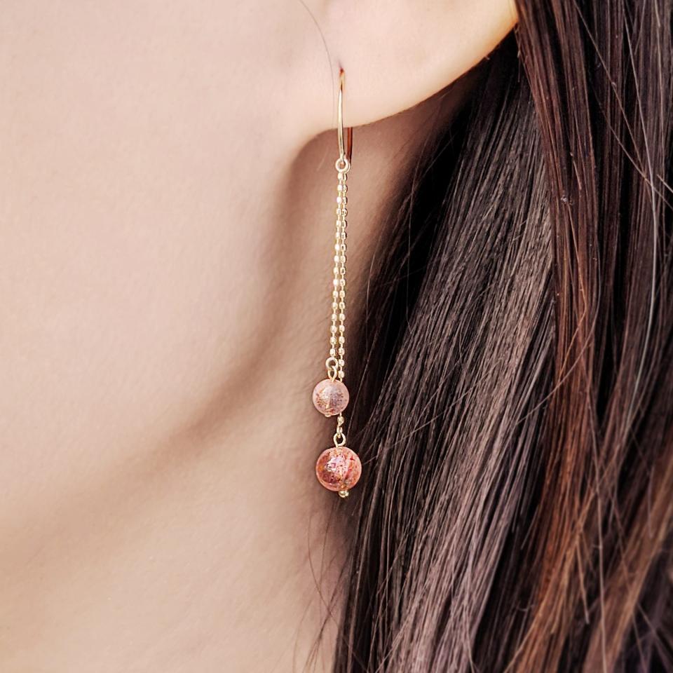 珍しいクォーツが目惹くワイヤーピアスです。レピドクロサイト・イン・クォーツという赤いグリッターのようなキラキラとした内包物が美しい天然石を使用しています。