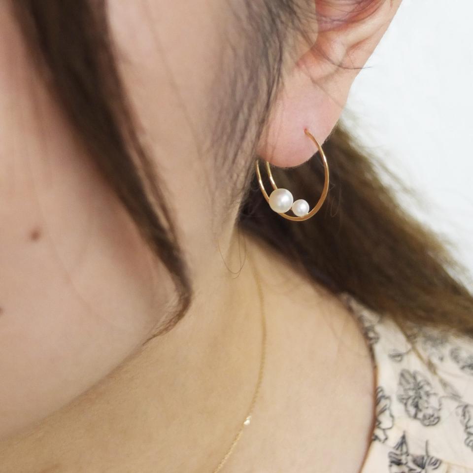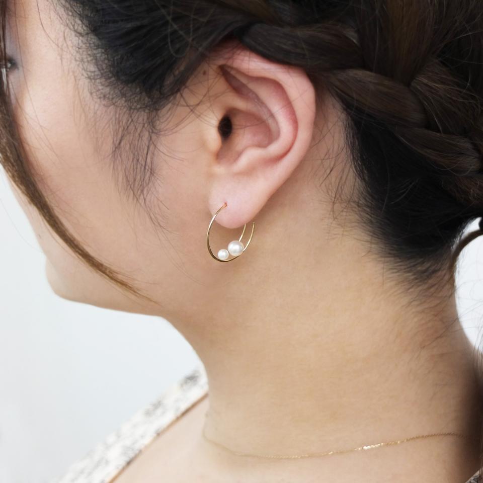 フープが描く空間に輝くパールの白さが上品でありながらモダンな印象で耳元を飾る高級感のあるデザインです。