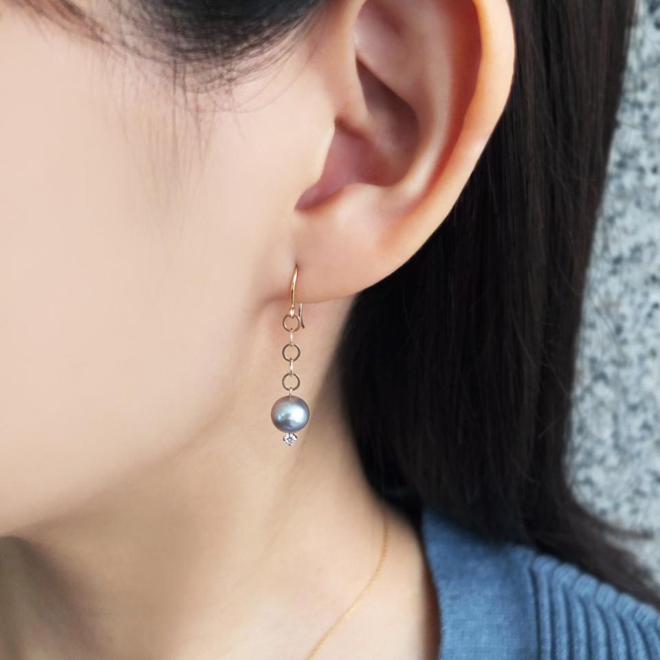 グレーのタンスイパール(ポテト)の下にさりげなくあしらったCZとゴージャスなチェーンのコントラストが華やかに耳元を彩ります。