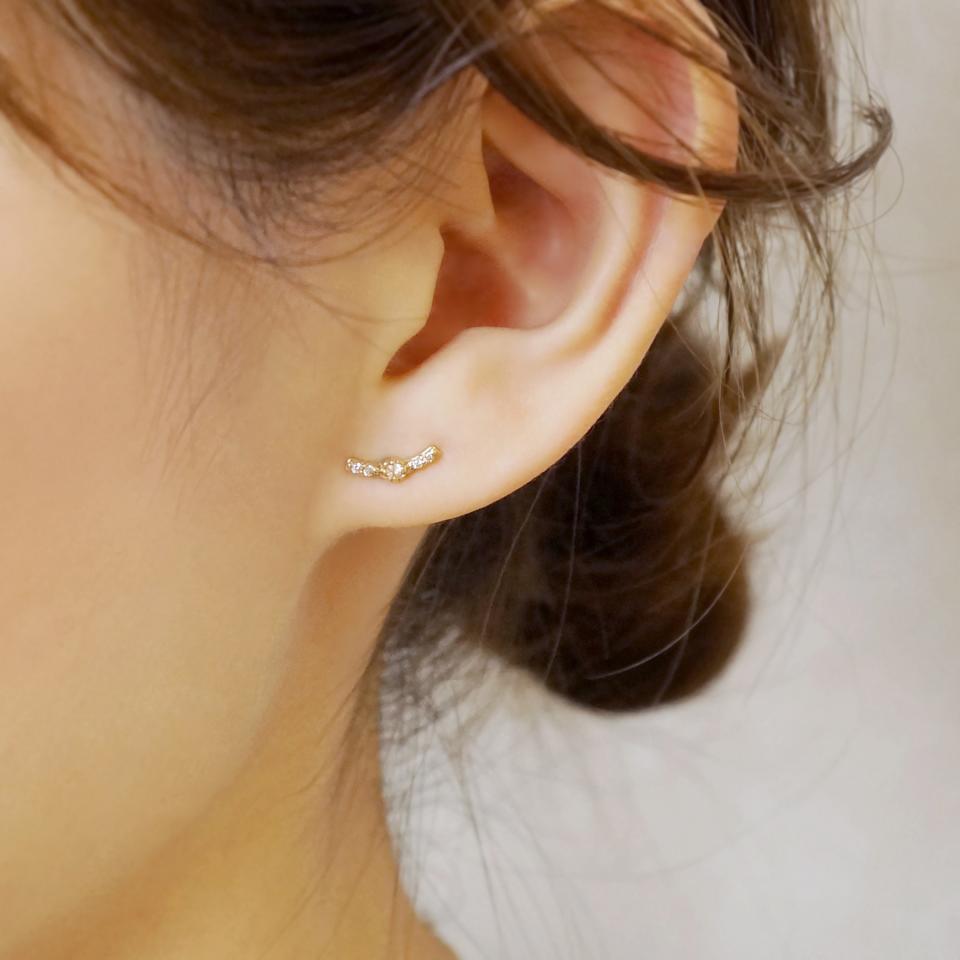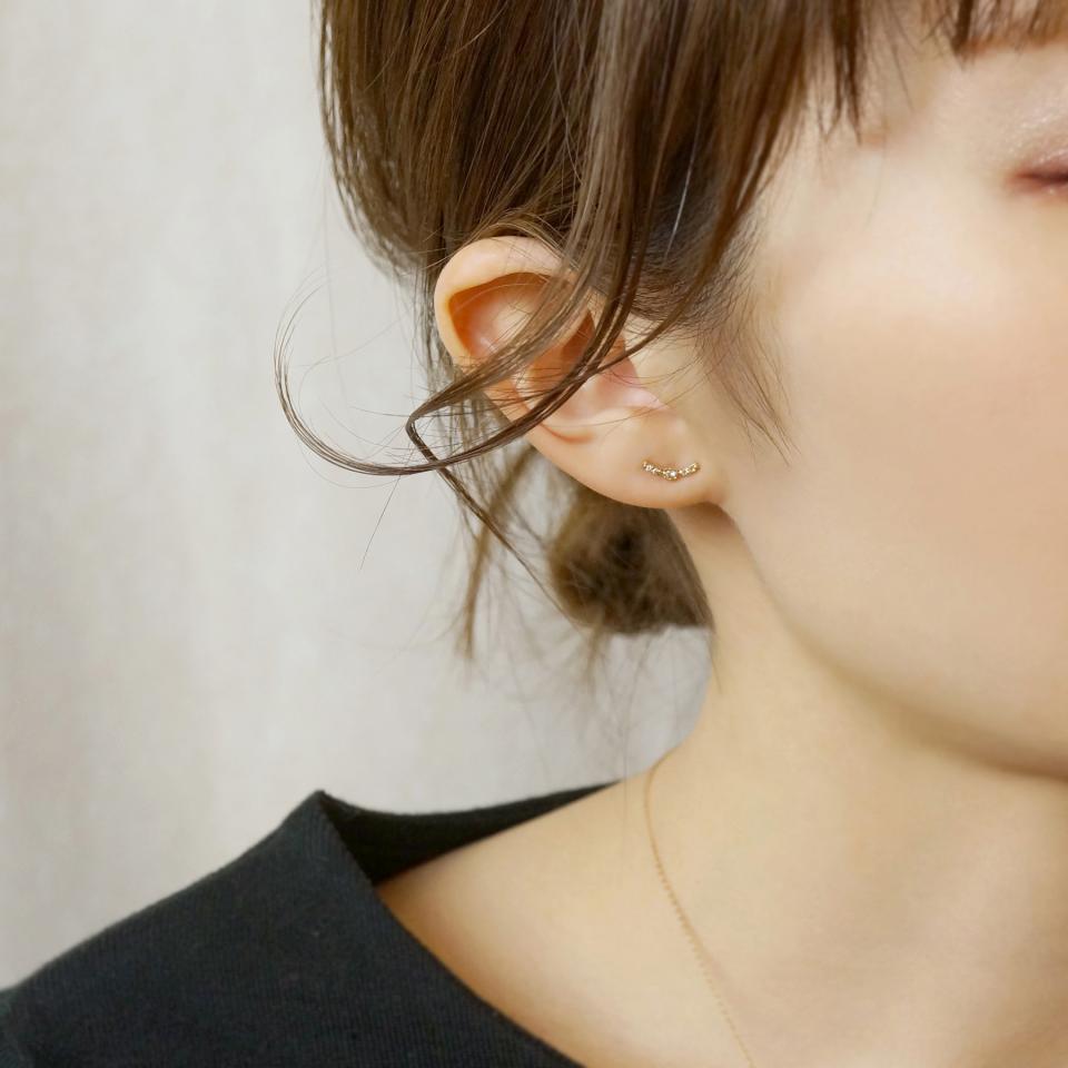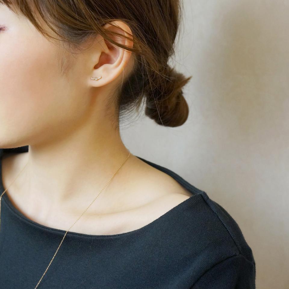 優しいアーチ状で横に並ぶようにダイヤモンドをあしらうことで、耳たぶに沿うように輝きが広がるピアスです。