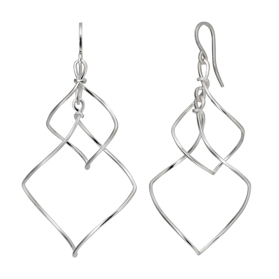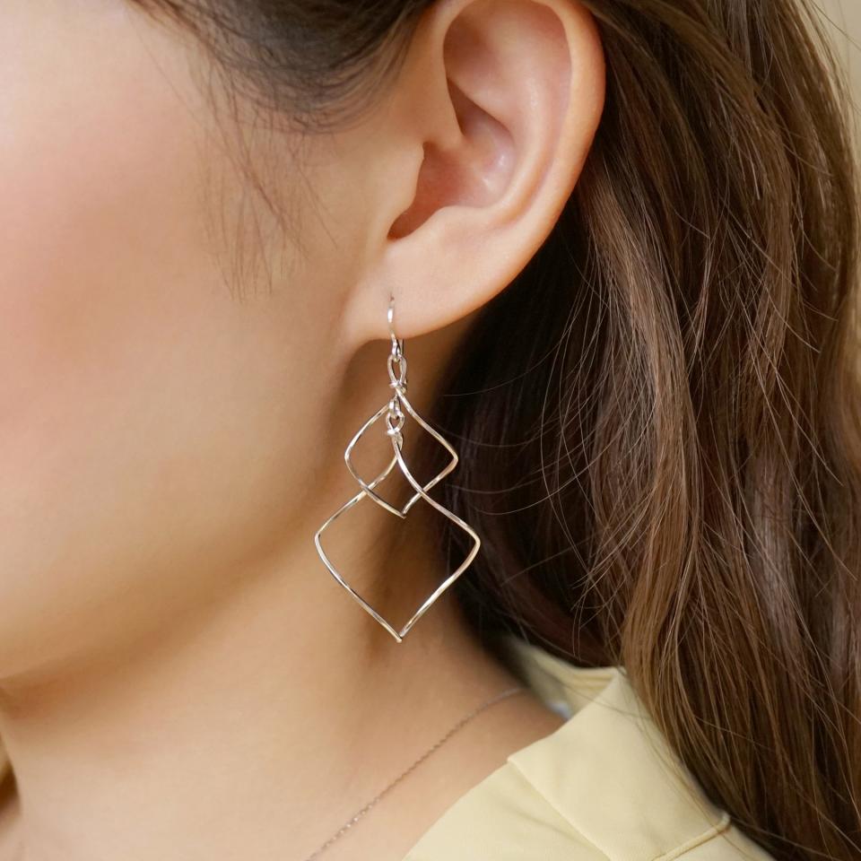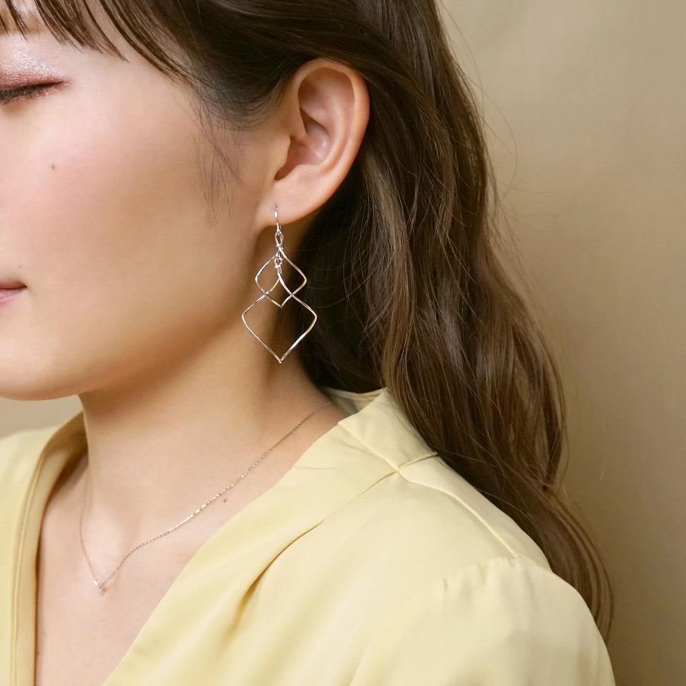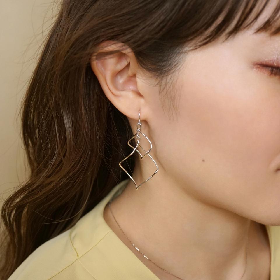 線材にひねりを加えながらひし形にすることで、横からの立体感も楽しめるデザイン。上下縦に並んだ2つのモチーフが揺れ動くことで様々な表情を見せてくれます。