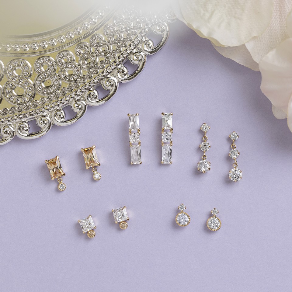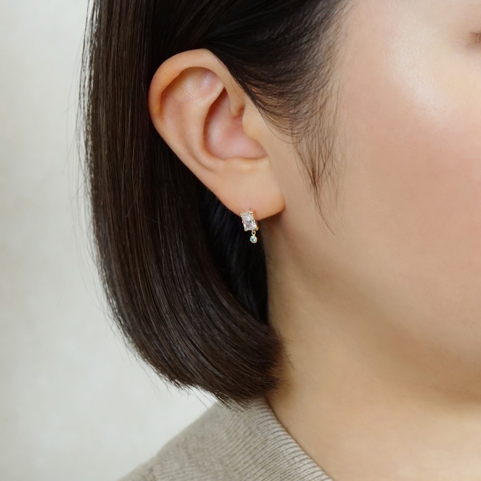 どんなコーディネートにも合わせやすいクリアカラーに、ミル打ち風のクラシカルな石枠で上品な印象。ライトブルーの石がアクセントに揺れ煌めきます。