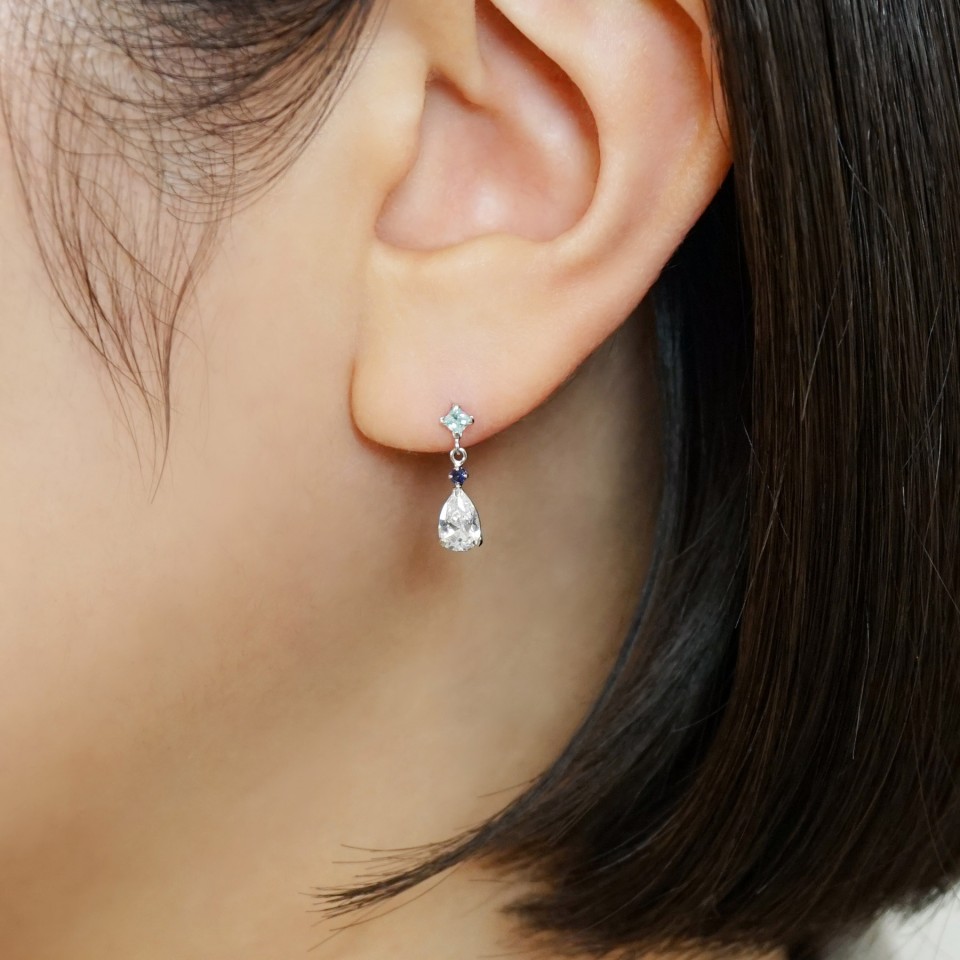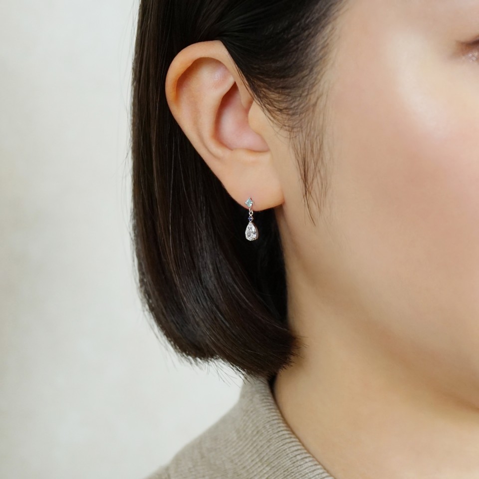 しずくが揺れ煌めくホワイトゴールドのスイングピアス。