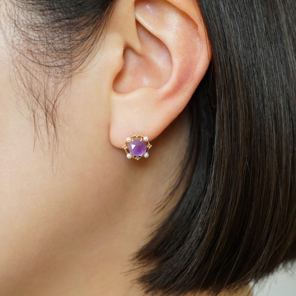 K10イエローゴールド(ポスト、キャッチ部分のみK18イエローゴールド)、アメジスト、ピンクシェル、タンスイパール