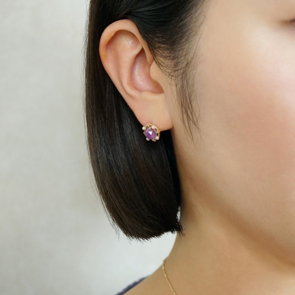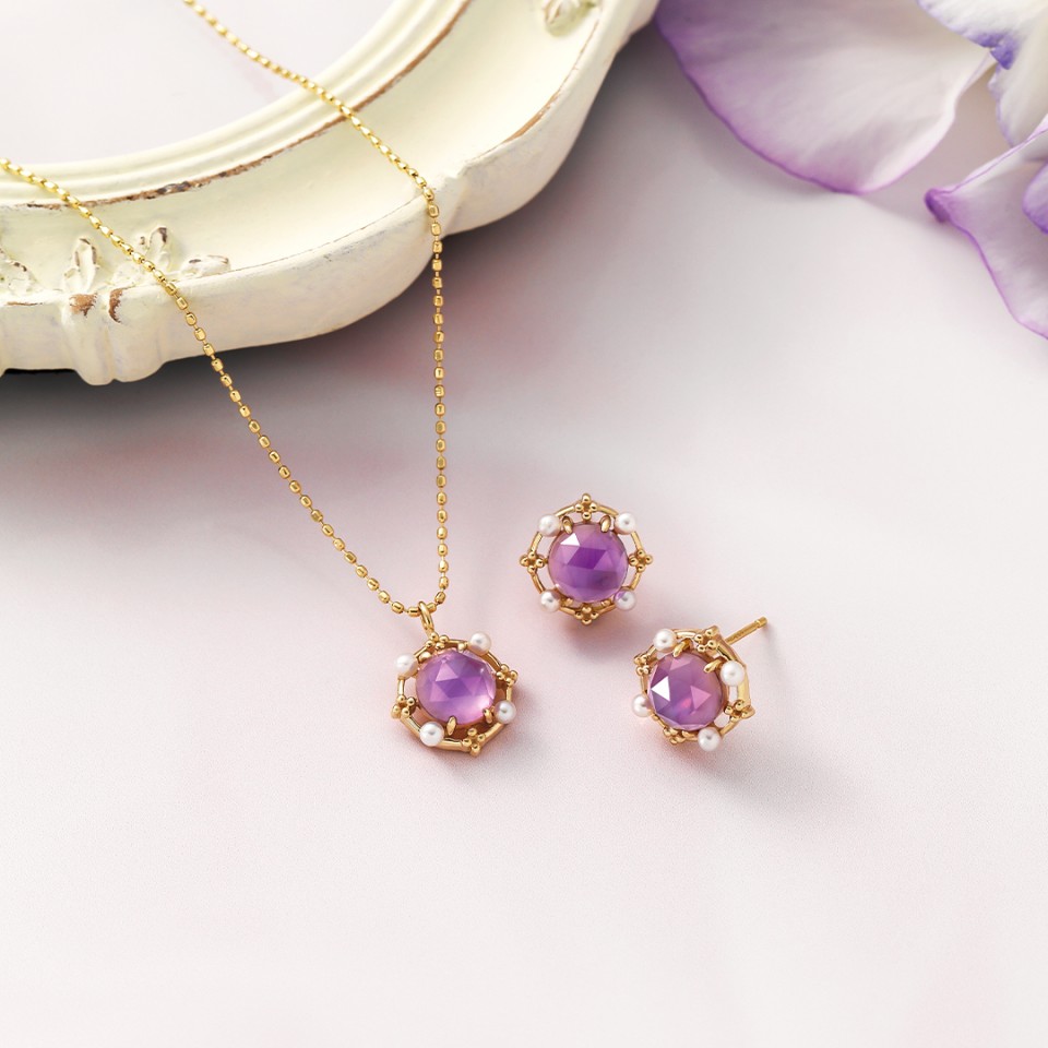 ピンクシェルの上にアメジスト(2月誕生石)を貼り合わせたローズカットの石は、小さな花々が咲く幻想的な丘をイメージしています。小さなタンスイパールは、花開く前の蕾や甘い香りにさそわれてあつまった蝶々達の様…。