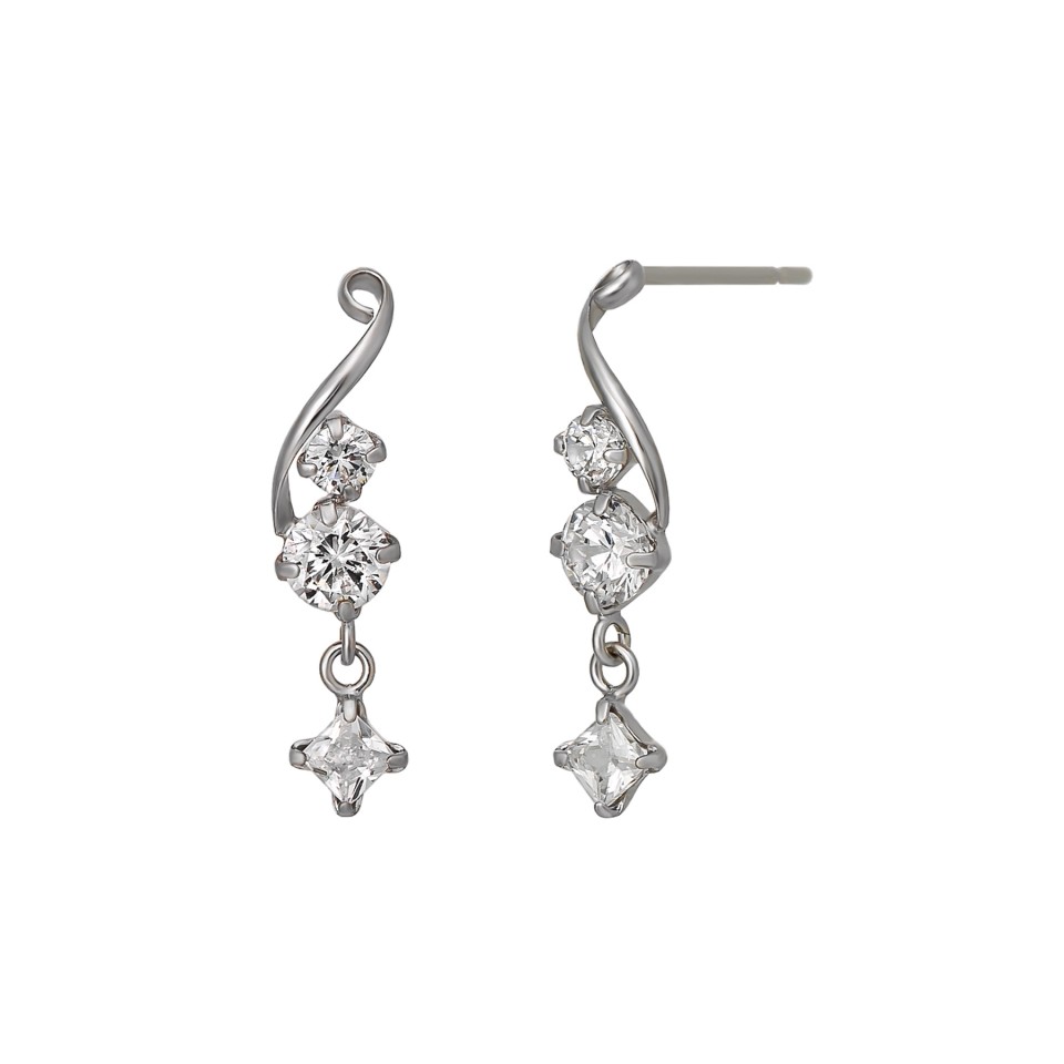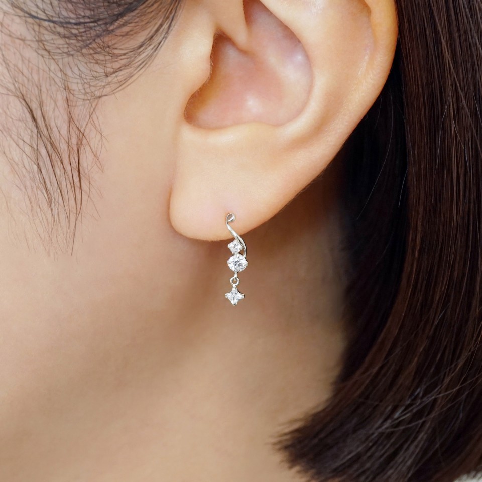 人気のヒネリと石の煌めきが美しいホワイトゴールドのスイングピアス。