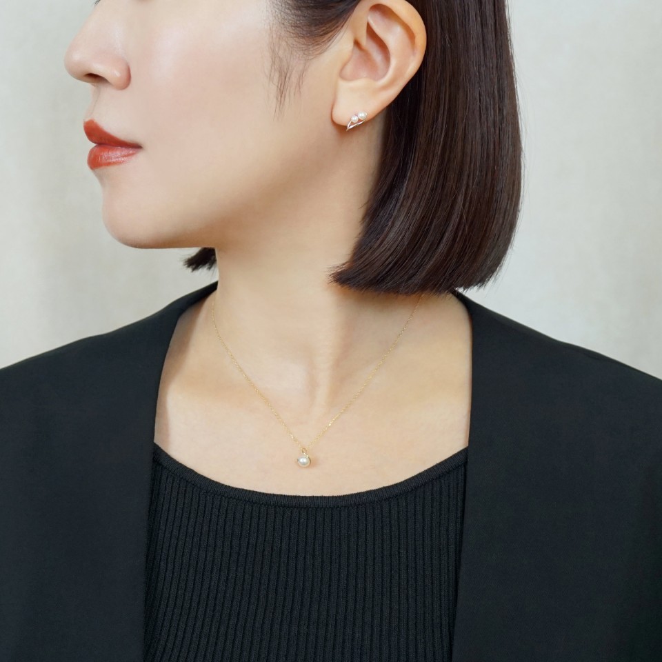 シャープな地金のラインに艶のあるパールが女性らしい印象を与えます。カジュアルにもフォーマルにも身に着けていただけます。