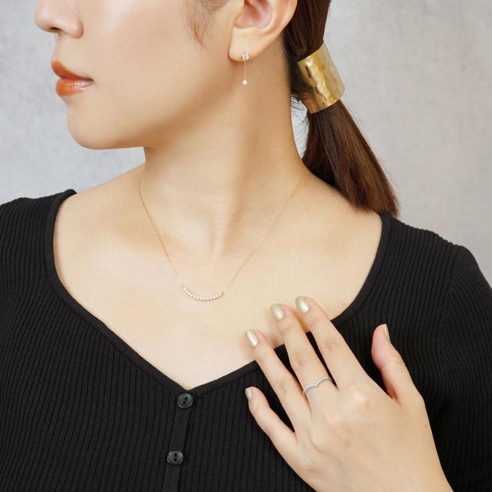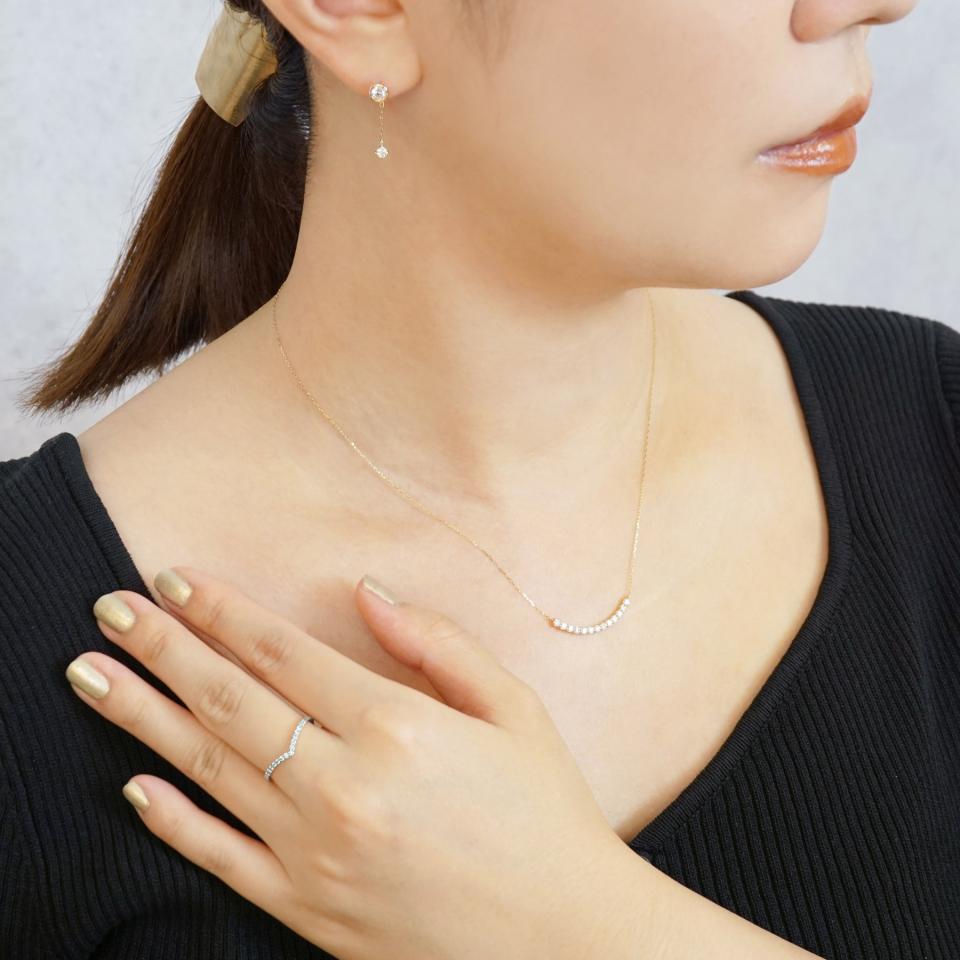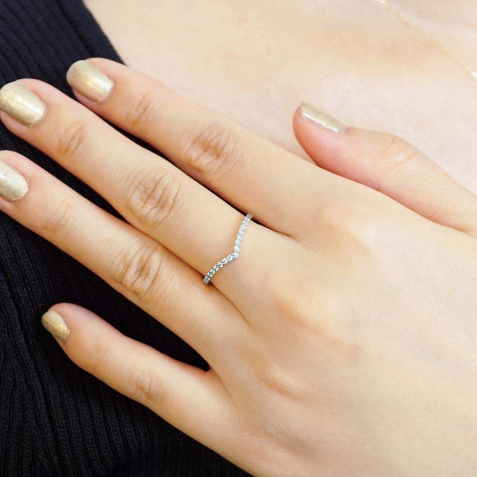 開いた本のようなV字のラインの輝きが美しいリングです。腕の幅を石のサイズぴったりに合わせることで、V字のシルエットがはっきりと見えるので、より一層指のラインを綺麗に見せてくれます。重ね付けもしやすく、いつものお気に入りのリングの印象が変わり、よりオシャレな印象の手元を演出してくれます。