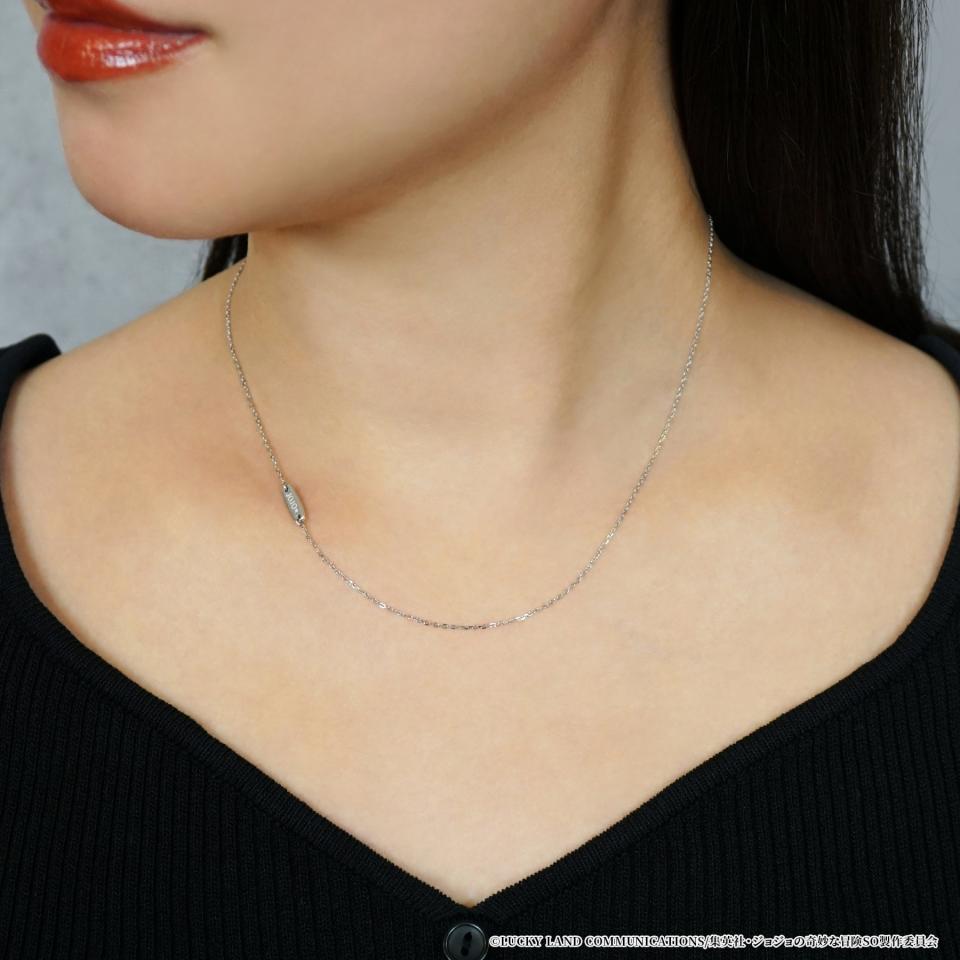 『JOJO★』の刻印が施されたプレートをあしらったチェーンネックレス。ベーシックながら華やかさのあるチェーンを使用し、プレートは中心から少しずらすことで抜け感のあるデザインに仕上げました。別売りのチャームを通して使用するのはもちろん、チェーンだけでもおしゃれに着けていただけます。長さと太さを変えた2種類をご用意しましたので、年齢や性別を問わずペアアイテムとしても楽しめるネックレスです。