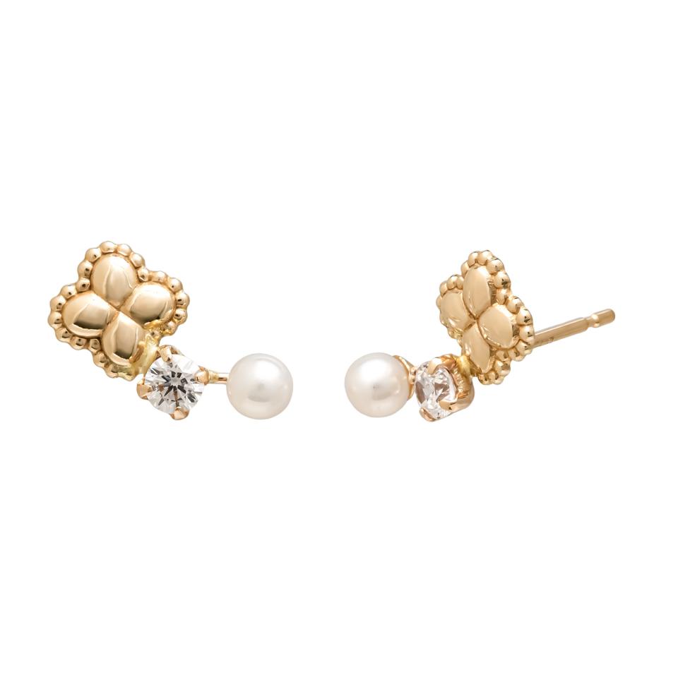 オリジナルのミルフラワーデザインに、タンスイパールとキュービックジルコニアを耳たぶに沿うようなラインで並べたショートミーティアのピアスです。