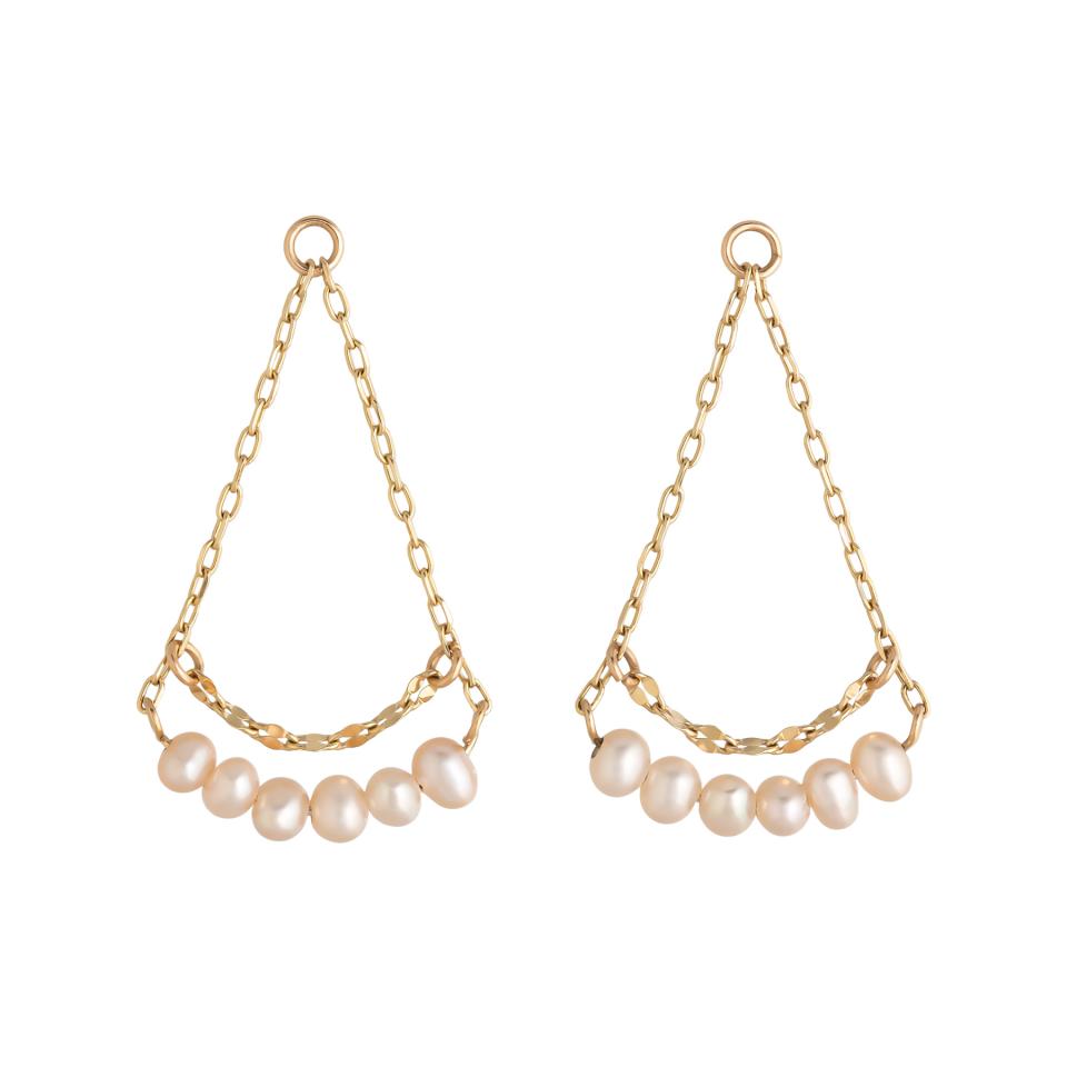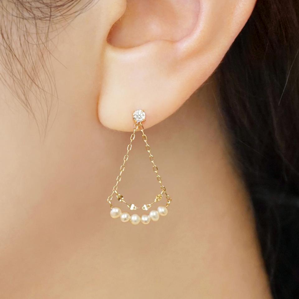 ナチュラルな形のタンスイパールを並べたデザインは、程よいエアリー感でやわらかな印象をみせてくれます。パールの上にデザインチェーンを加えることで繊細な輝きを放ち、優雅なニュアンスを添えます。存在感があり、ショートチャームとも組み合わせができる万能なチャームです。