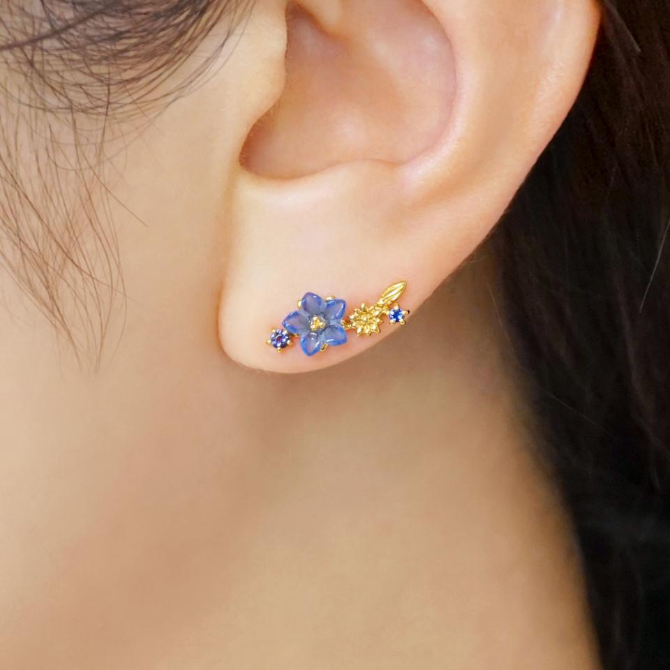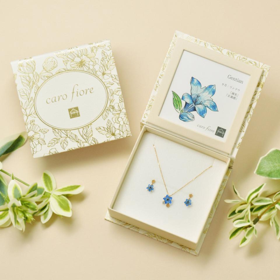 一本の茎から沢山の花を咲かせる姿を、立体的なオリジナルカットを施したブルークォーツと地金のお花と蕾で表現しています。アイオライト(3月誕生石)とサファイヤ(9月誕生石)をあわせることで豊かなバリエーションのブルーがリンドウの咲く姿に奥行を演出してくれます。