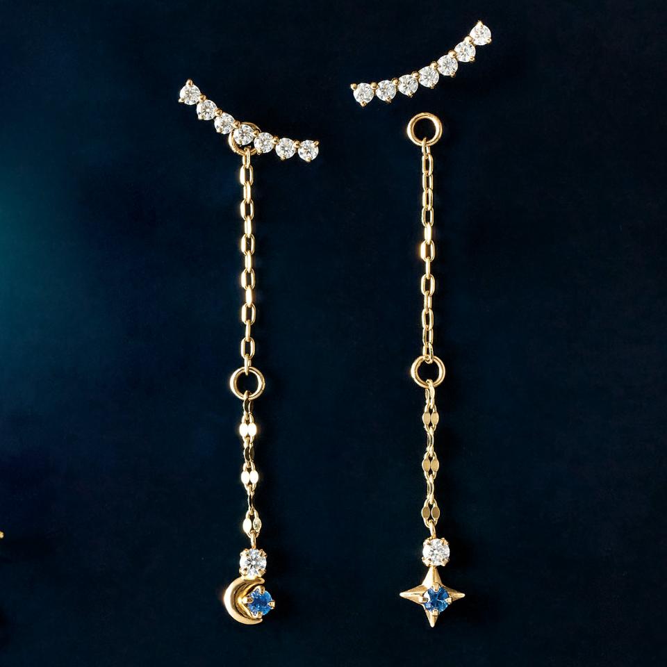 月と星のモチーフをさりげなくあしらい世界観を表現しています。ブルーサファイヤ(9月誕生石)とモアサナイトの青と白のコントラストが大人の印象です。