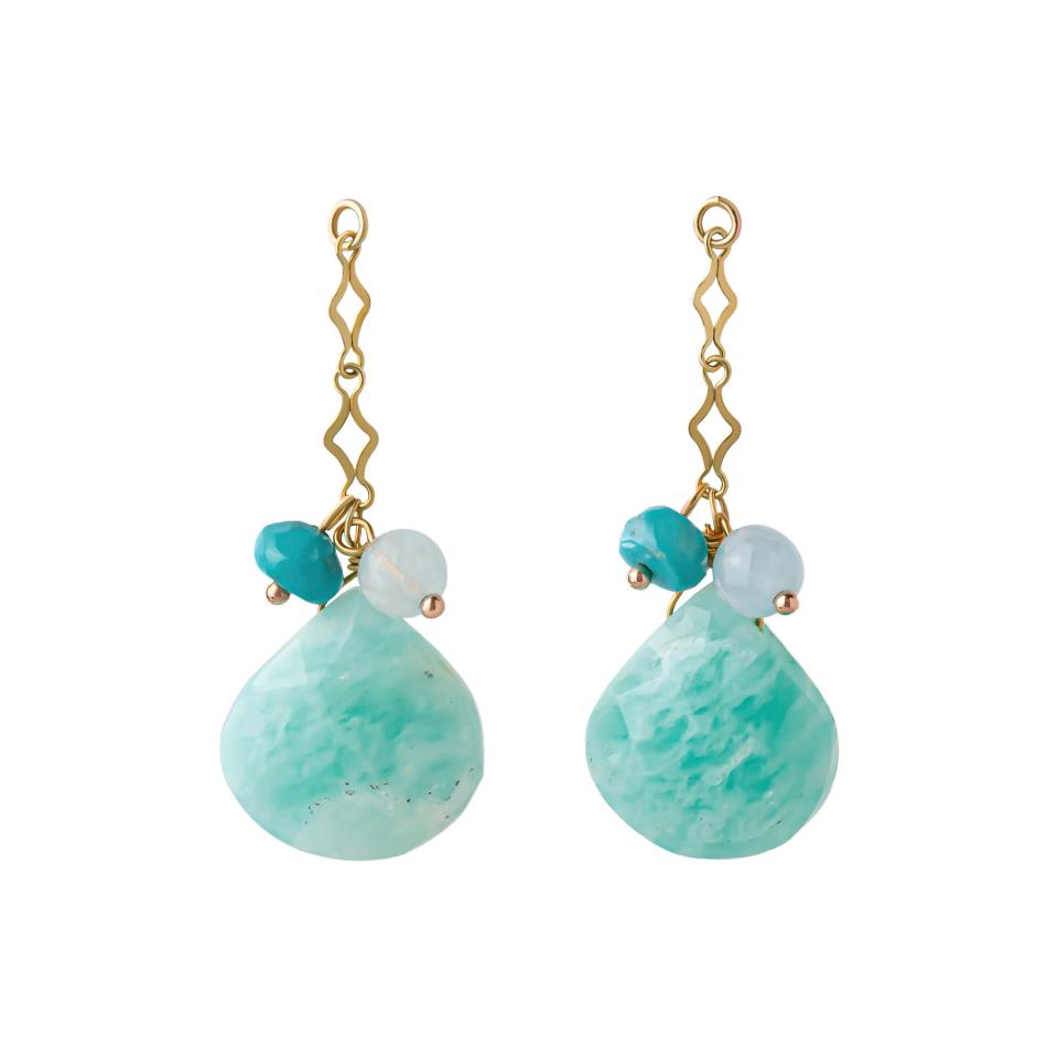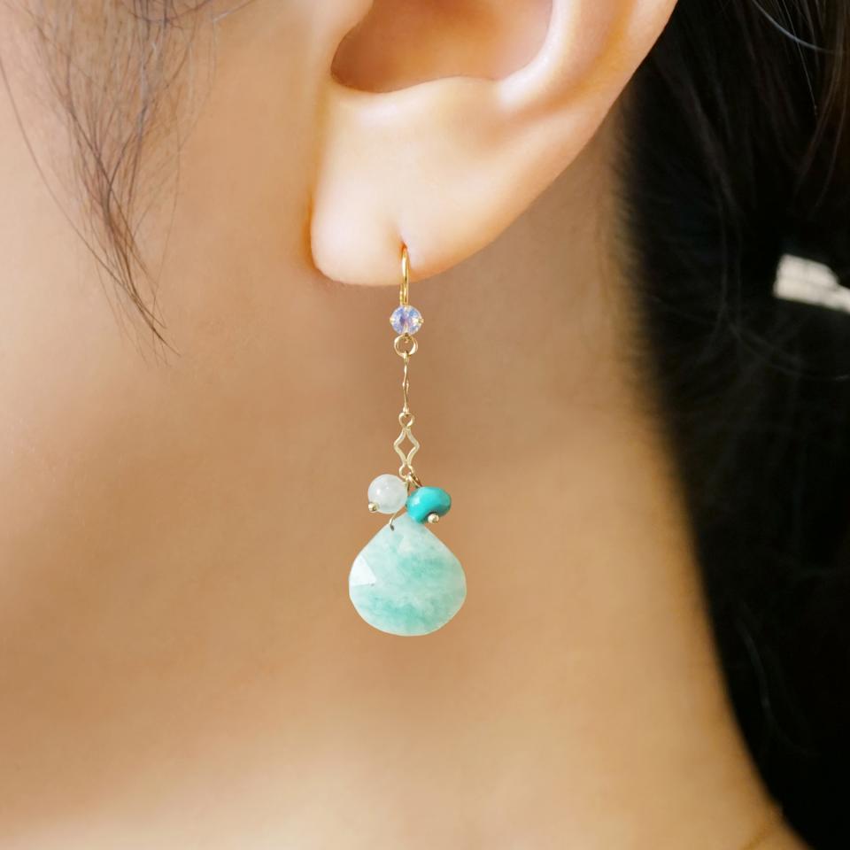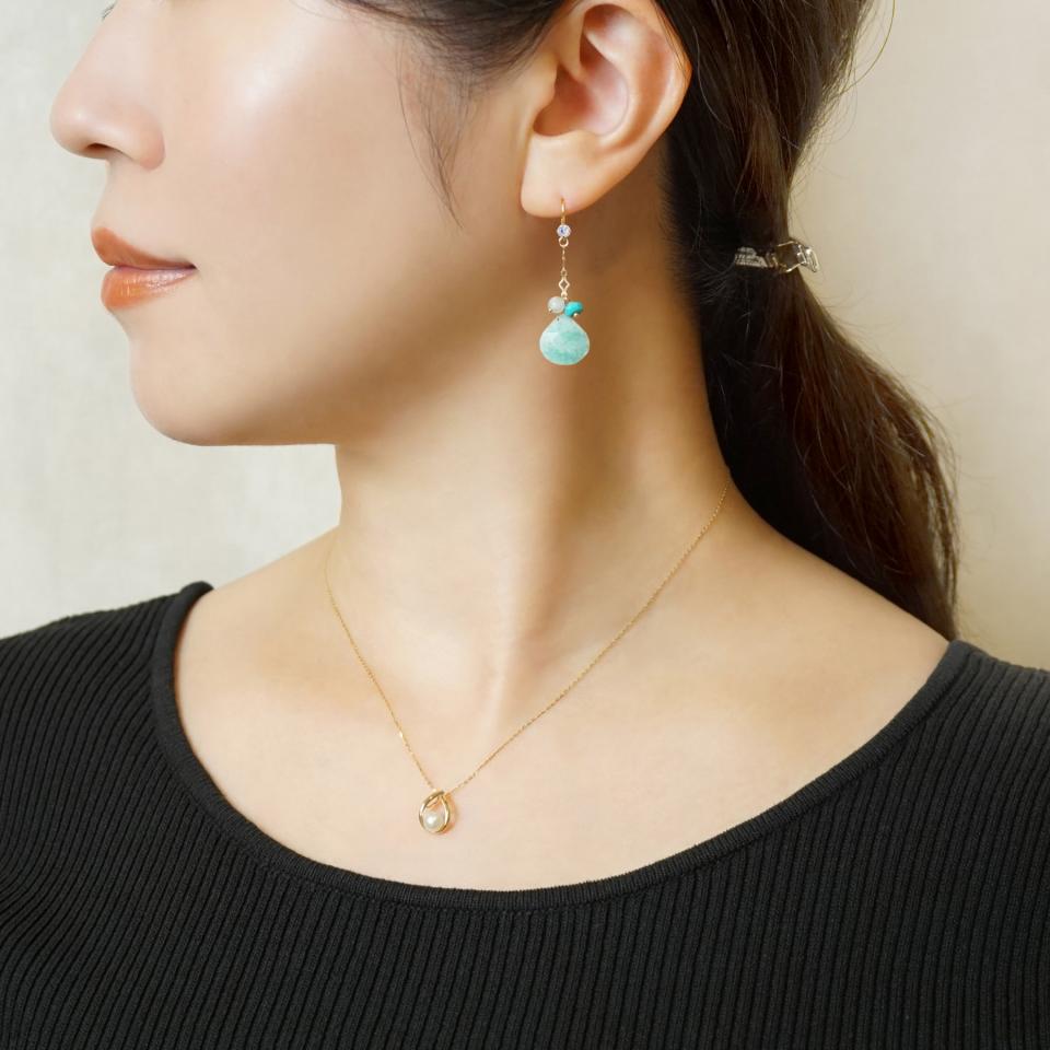 爽やかな色合いのアマゾナイトはコーディネートに明るさをプラスし、キラキラ輝くデザインチェーンがお顔周りを華やかに彩ります。ターコイズ(12月誕生石)、アクアマリン(3月誕生石)が愛らしい表情をプラスします。