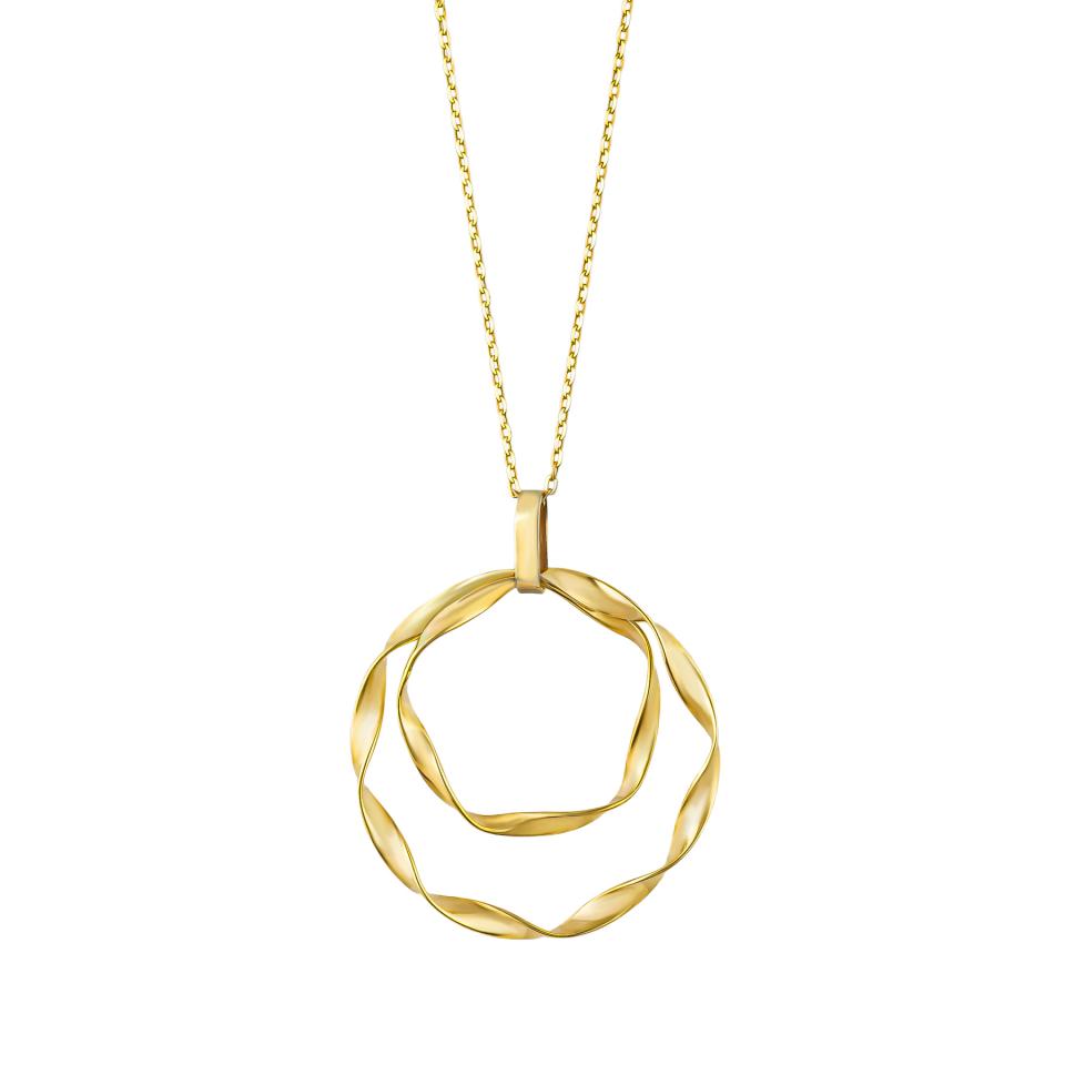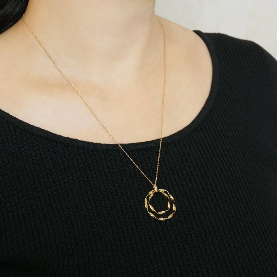 ひねりを加えたリボン状のゴールド地金をサークル状にしてデザインしたネックレスです。