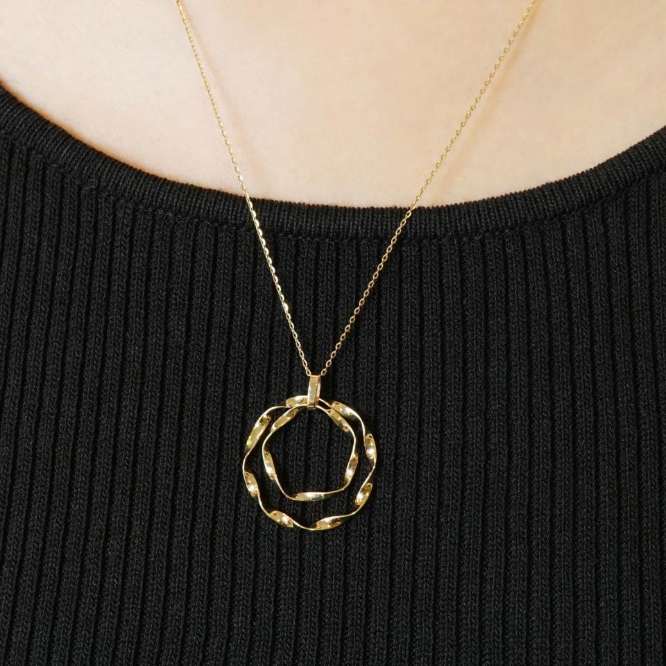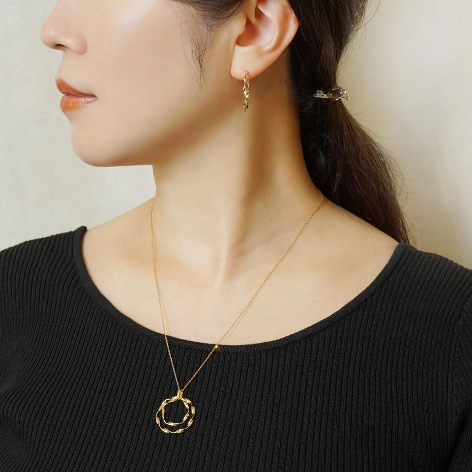 大小二つのサークルを組み合わせた存在感のあるデザインは、揺れるたびに複雑に光を反射して胸元を華やかに演出します。