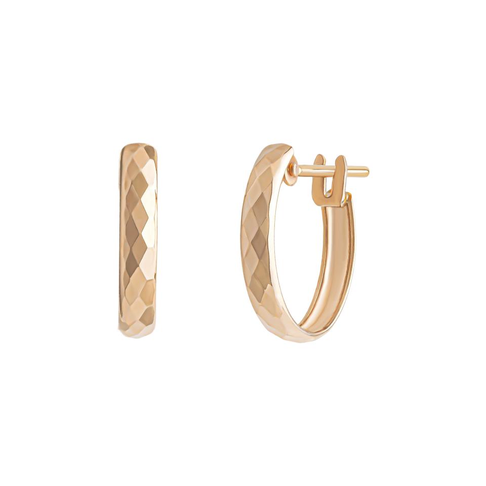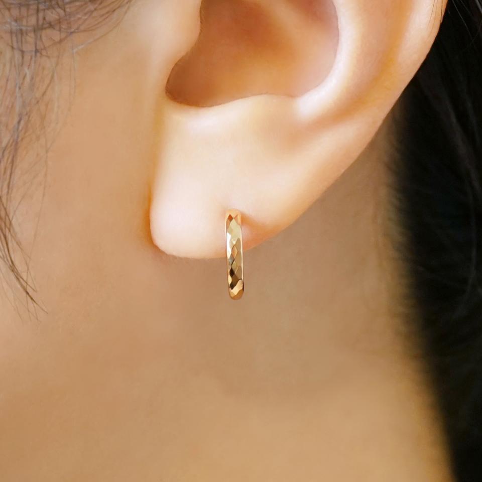 ひし形の面が連なりキラキラと光を反射して輝くフープピアス。