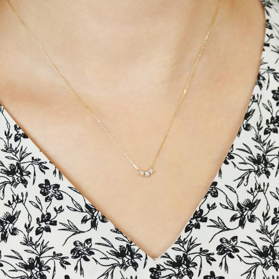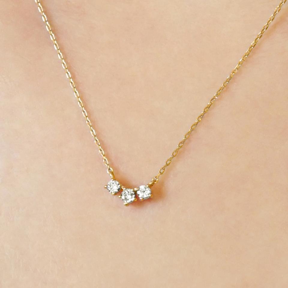 3石のダイヤモンドが「現在」「過去」「未来」を表すと言われるトリロジータイプのネックレス。