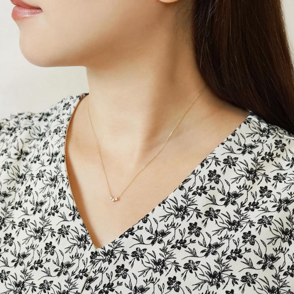 デコルテに沿う緩やかなアーチがエレガントで上品な仕上がり。自分へのご褒美にも、大切な人への贈り物にも素敵なネックレスです。