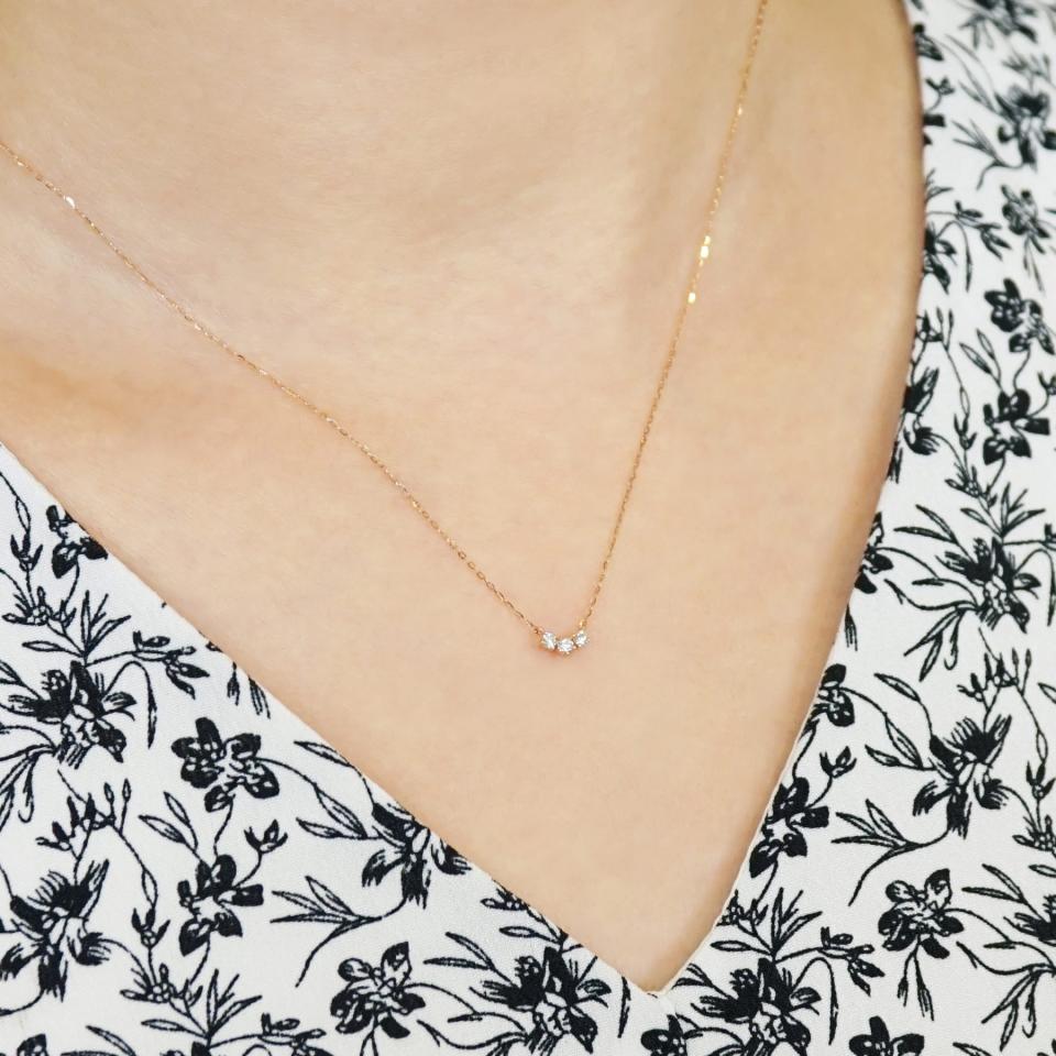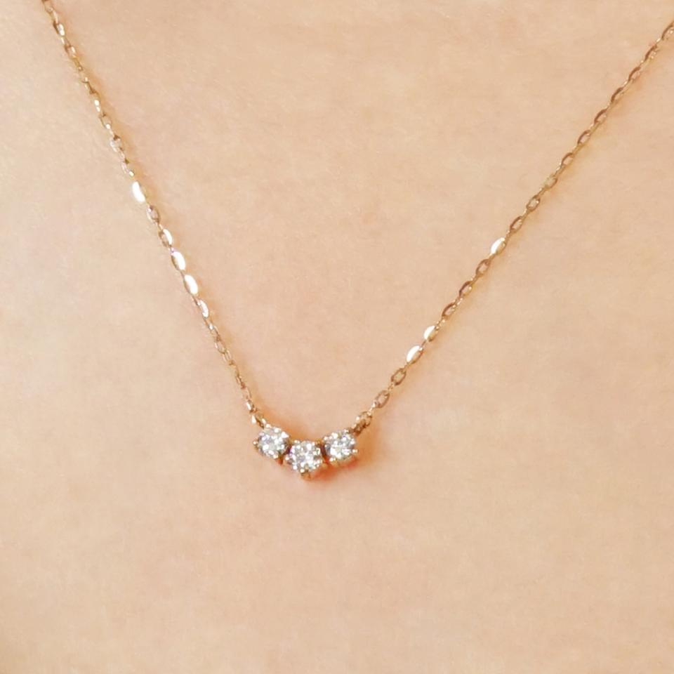 3石のダイヤモンドが「現在」「過去」「未来」を表すと言われるトリロジータイプのネックレス。