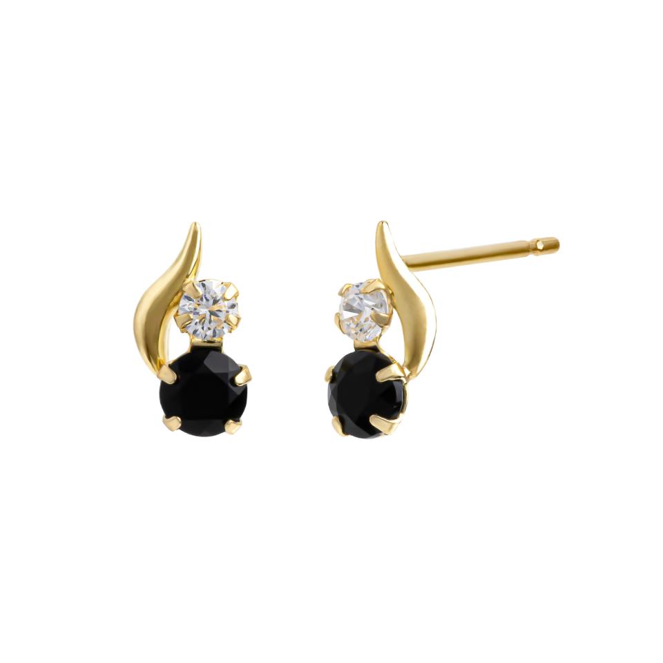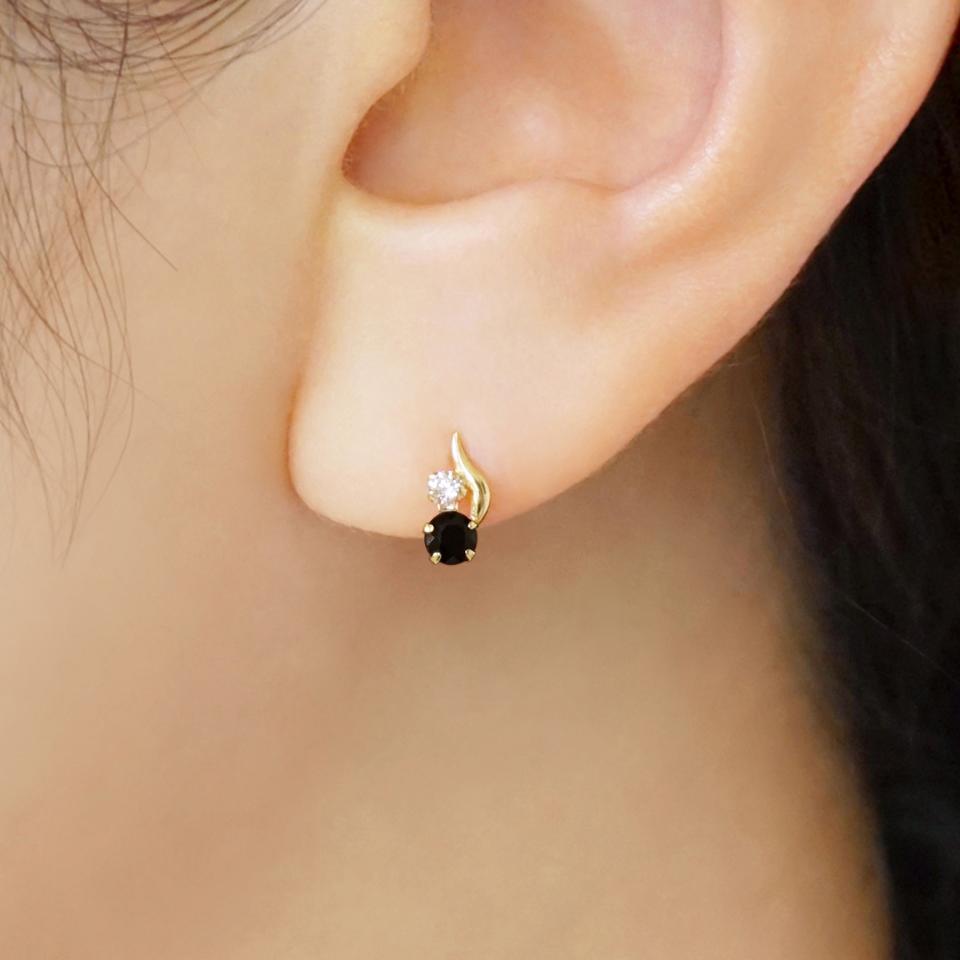 イエローゴールドの光沢がオニキスの落ち着いたきらめきを引き立てるデザインです。オニキスの上にはクリアなキュービックジルコニアをあしらい、シャープな輝きをプラスしています。どんなコーディネートにでも合わせやすいアイテムです。
