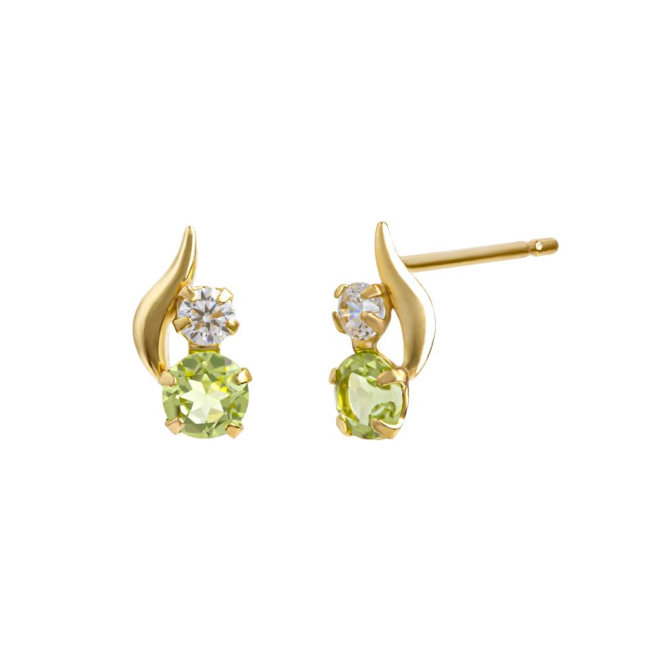 イエローゴールドの光沢がペリドットの爽やかなきらめきを引き立てるデザインです。ペリドットの上にはクリアなキュービックジルコニアをあしらい、シャープな輝きをプラスしています。どんなコーディネートにでも合わせやすいアイテムです。