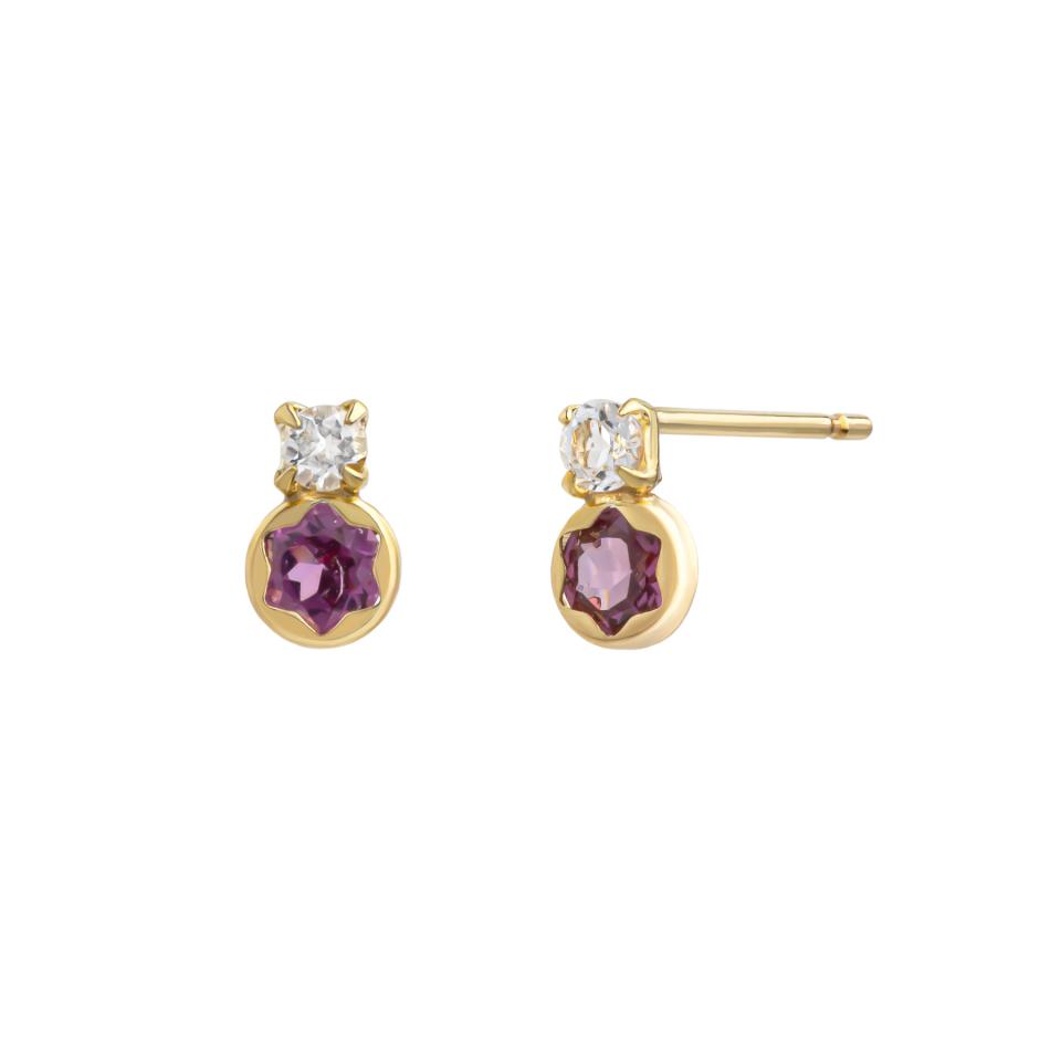 星型に切り抜かれた石枠にロードライトガーネットを留めることで、シンプルながらも個性的なシルエットを生み出しています。うるうると瑞々しいホワイトトパーズの輝きを添えられ、耳元にアクセントをプラスしてくれます。