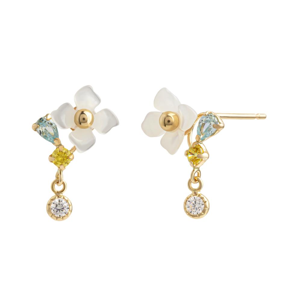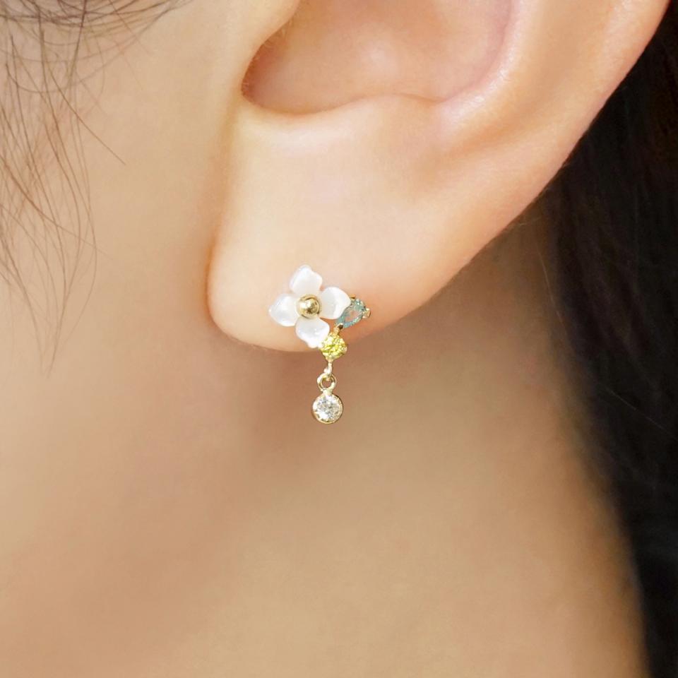 シンプルな4枚花のカービングシェルと爽やかなカラーリングのキュービックジルコニアを組み合わせ、可愛すぎないフラワーデザインに仕上げました。ホワイトシェルの柔らかな光沢が優しい印象を与えてくれます。