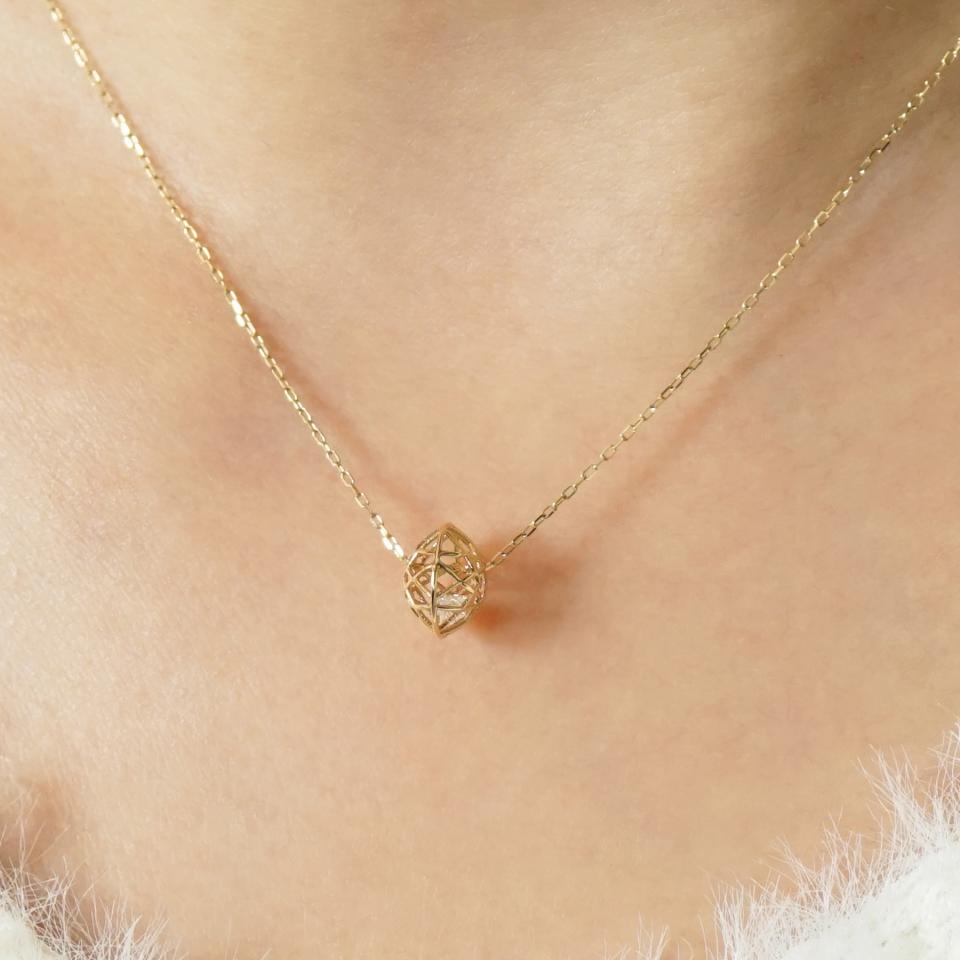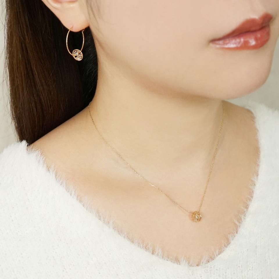 センターに八芒星のシルエットが浮かび上がる繊細な透かしが美しいカゴの中には、星形のキュービックジルコニアを閉じ込めました。カゴは取り外し可能ですので、チェーンだけでもお使いいただけます。