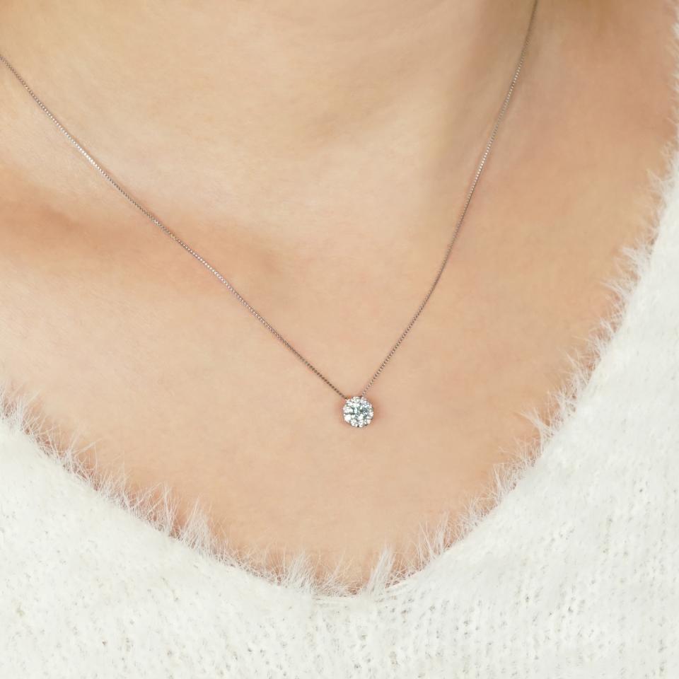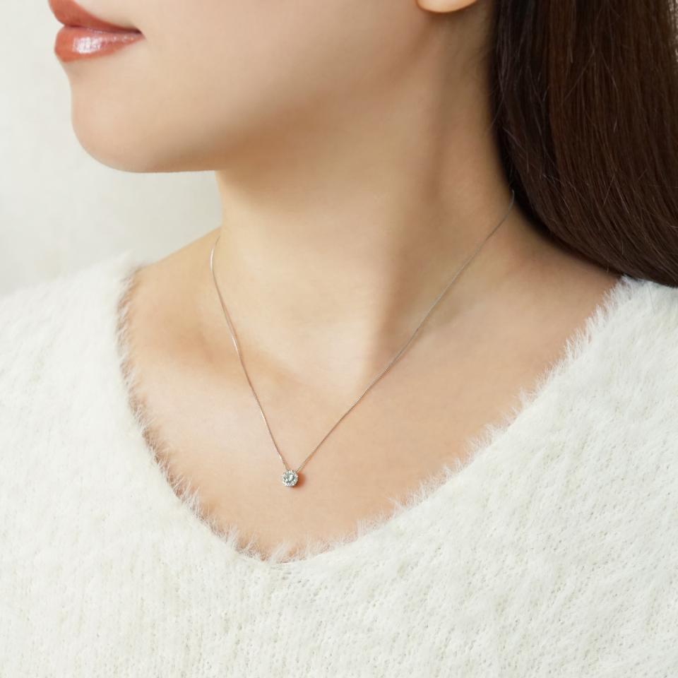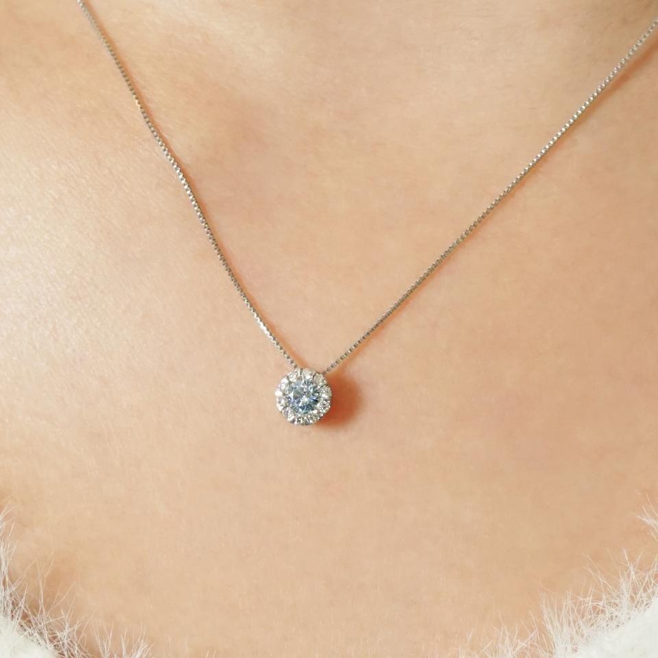 0. 15ctのアイスブルーダイヤモンドをホワイトダイヤモンドで取り巻いた大変贅沢なネックレス。