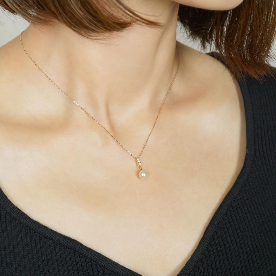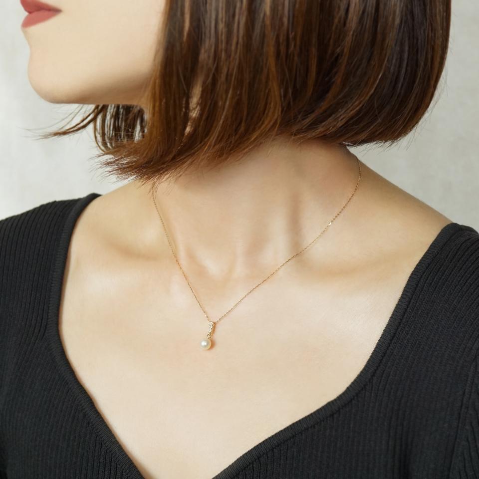 ホワイトトパーズを3石並べたトリロジーデザインには、“過去・現在・未来を愛する”という想いが込められています。その先で、優雅に揺れるタンスイパールが女性らしさを引き立てます。
