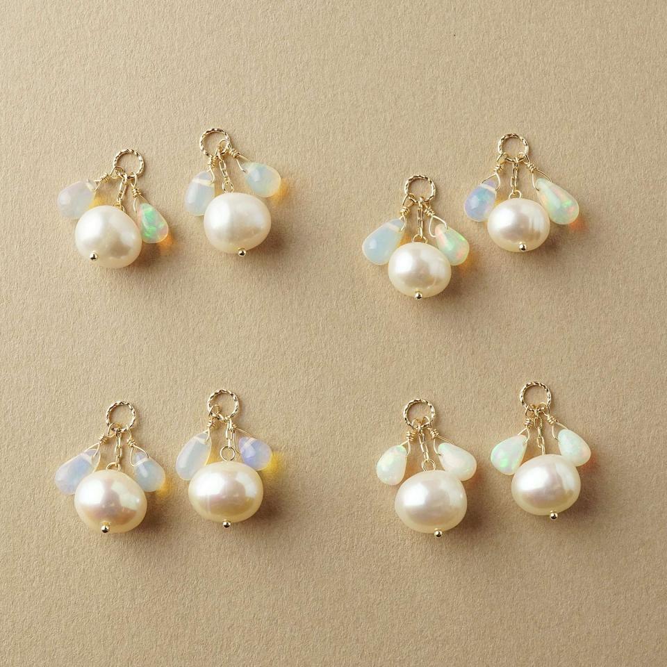 タンスイパール(6月誕生石)のチャームです。表面にカットのない、コロンとしたしずく型のオパール(10月誕生石)と組みわせました。オパールの艶めきが虹のように揺らめき、見るたびに新しい表情を見せます。楕円型の大きめパールをアクセントに、ニュアンスのあるホワイトカラーがどんなお洋服にも合わせやすく、視線を惹きつけるアイテムです。