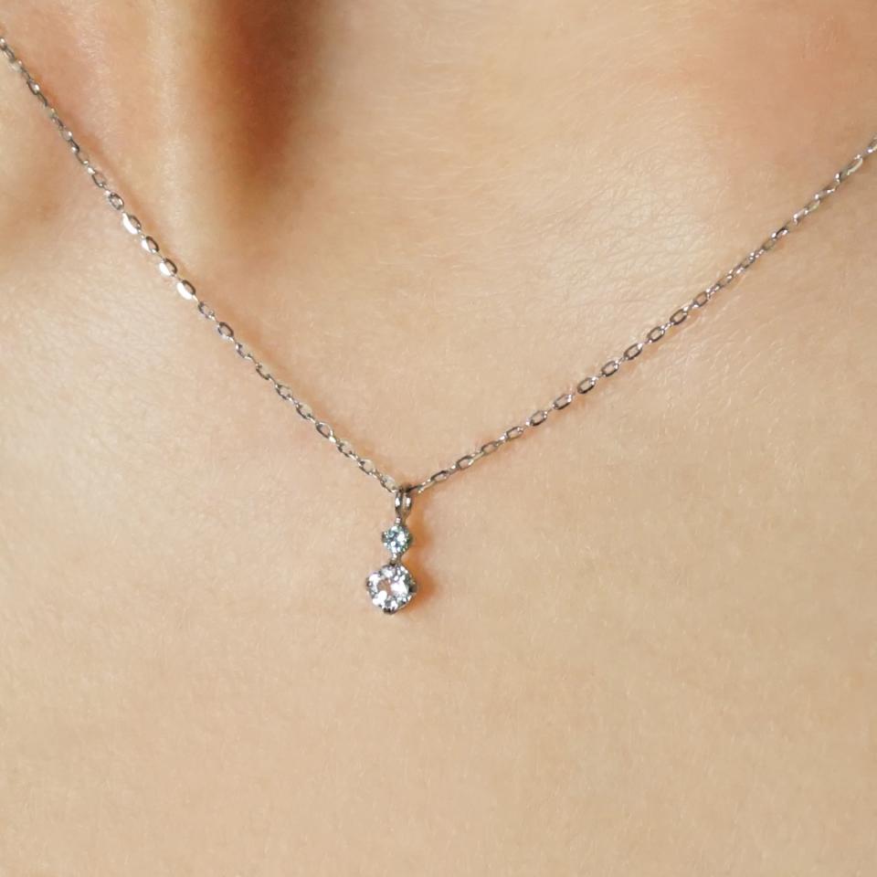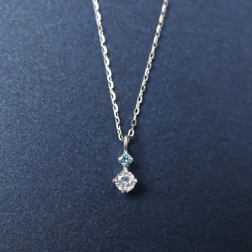 アイスブルーダイヤモンドとホワイトトパーズが揺れてきらめくネックレス。
