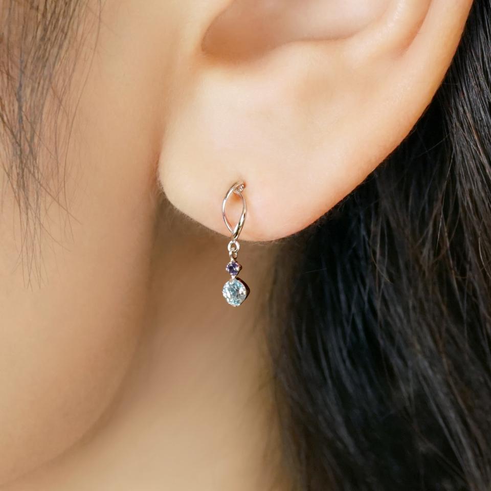 立体的なラインにスイスブルートパーズ(11月誕生石)が揺れるエレガントな雰囲気のピアスです。シンセチックサファイヤを添えて華やかさをプラスしました。着用するとしっかりと長さと立体感があり、ベーシックながらも存在感のあるデザインです。年齢問わず着用いただけます。