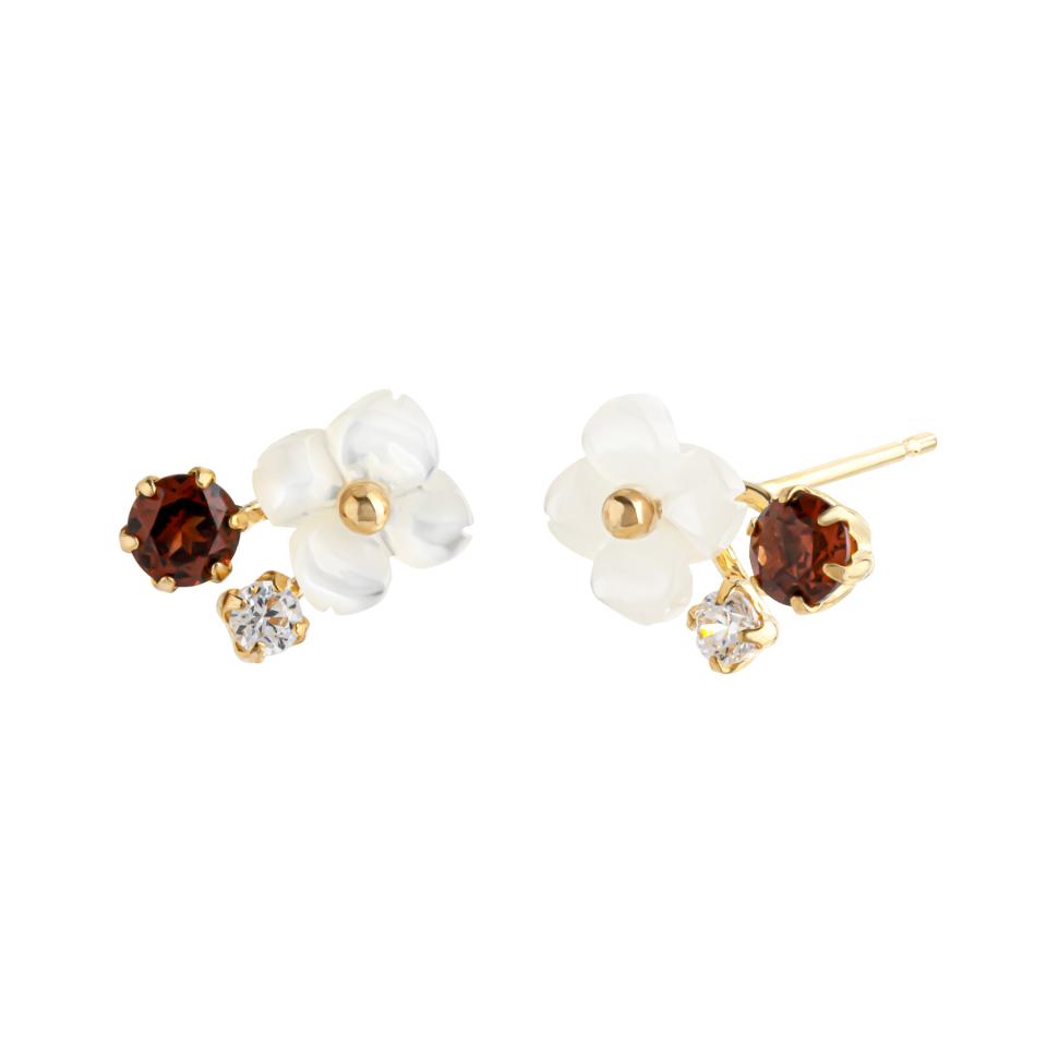 K10イエローゴールド( ポスト、キャッチ部分のみK18イエローゴールド)、ホワイトシェル、ガーネット、キュービックジルコニア(クリア)