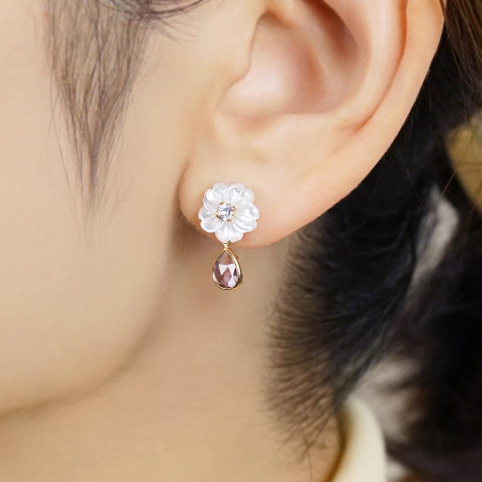 K10イエローゴールド(ポスト・キャッチ部分のみK18イエローゴールド)、ホワイトシェル、ライトアメジスト、ブルームーンストーン