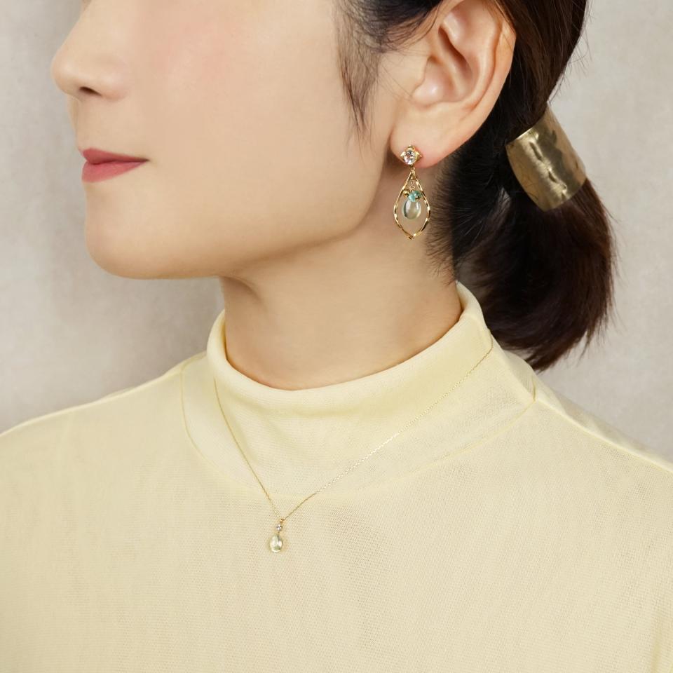 生まれたての新緑の葉のようなミルキーなグリーンが美しく、石の中に輝きをプラスしたいと思い、ピアスとカットを変えてデザインしました。繊細な立体感がポイントです。