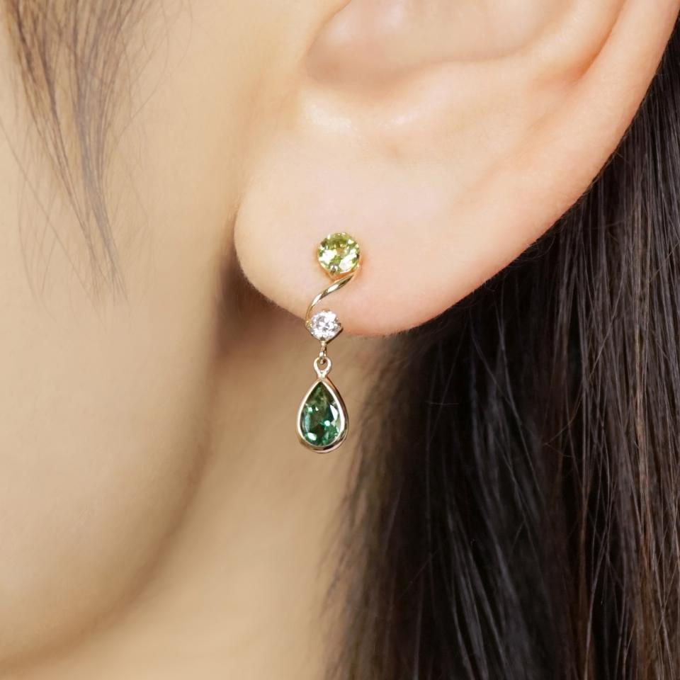 大粒のカラーストーンが顔周りを華やかに演出し、流れるような地金のラインと、雫モチーフをつるんと包み込む石枠が、やさしく女性らしい雰囲気を添えます。