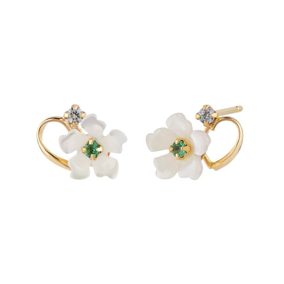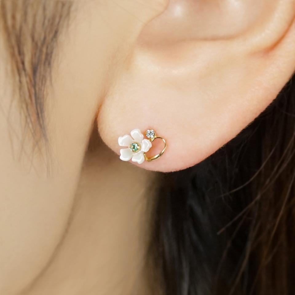 カーヴィングのホワイトシェルのお花にエメラルド(5月誕生石)とアクアカラーのキュービックジルコニアを合わせ、暖かいカラーリングで仕上げました。