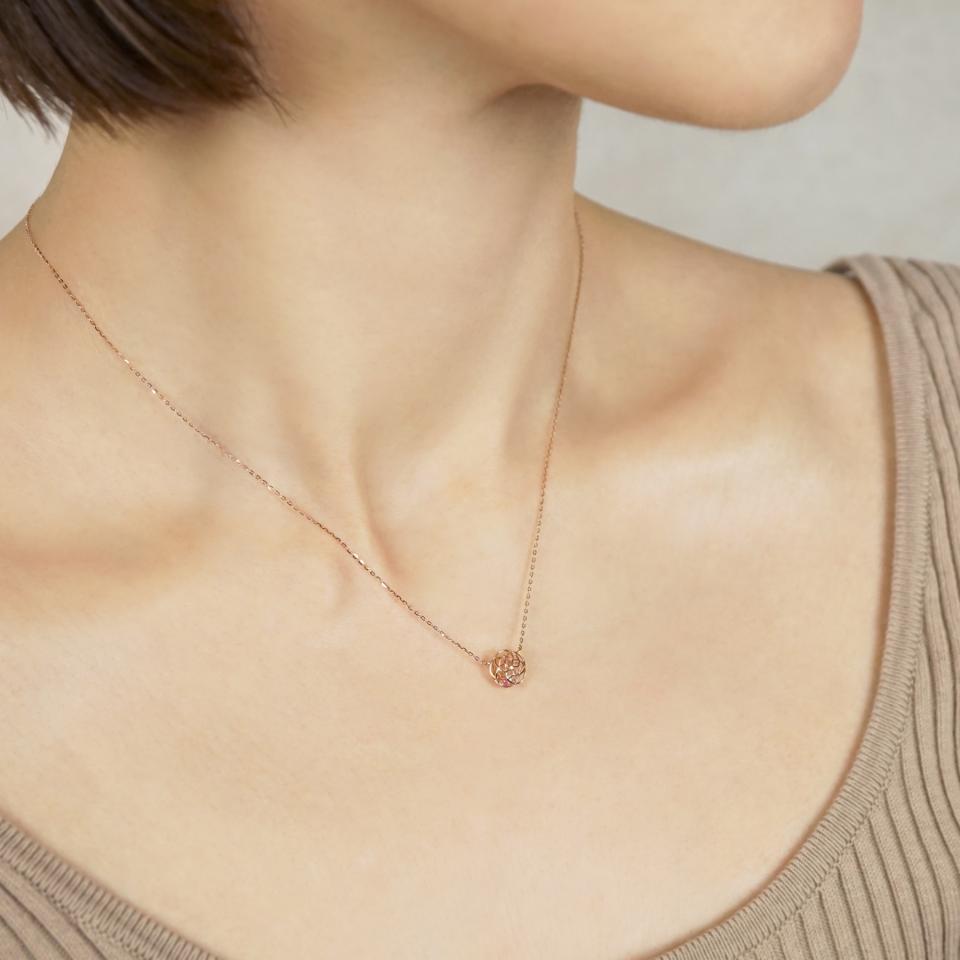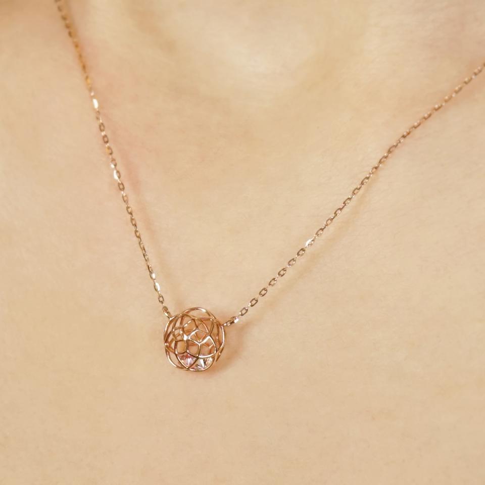 明るく温かみのあるピンクゴールドでおつくりしたカゴの中には、ピンクとクリアの2石のキュービックジルコニアを閉じ込めました。ふっくらしたフォルムのカゴの中で揺れ動く淡いピンクの煌めきが、胸元に春の優しさを印象付ける素敵なネックレスです。