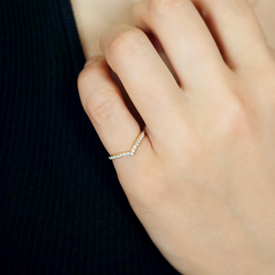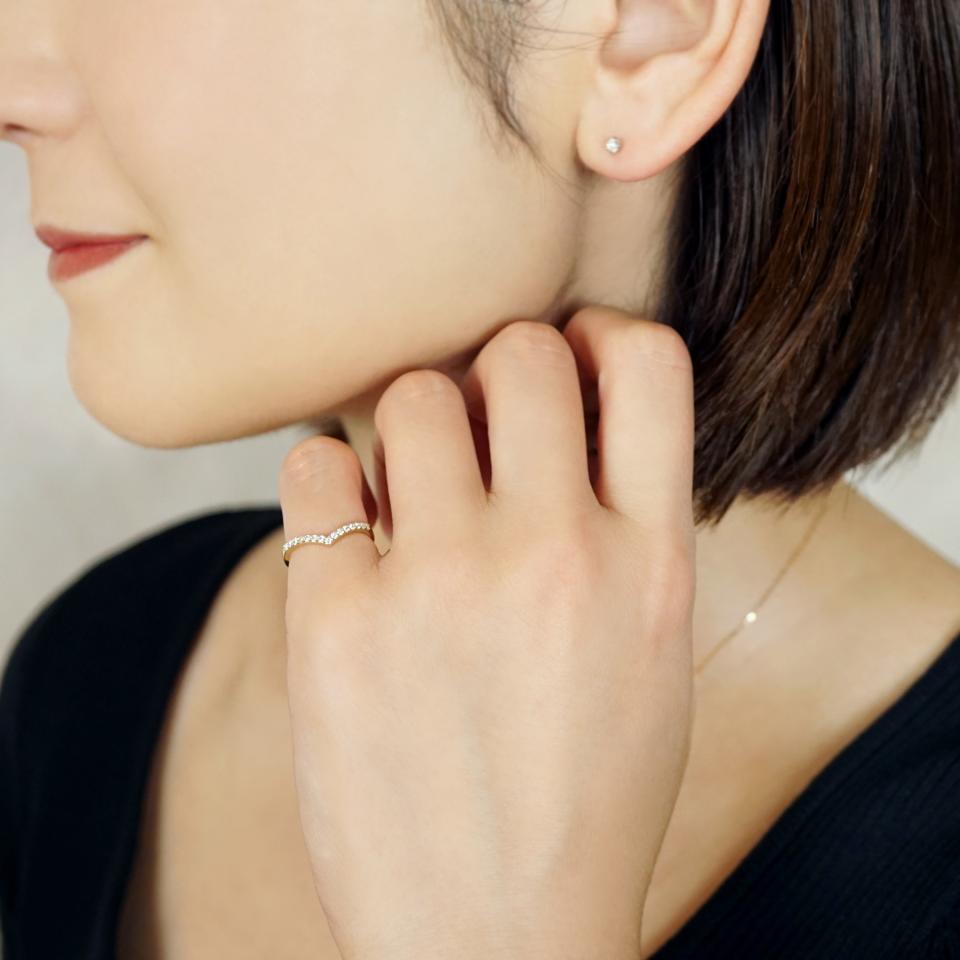 開いた本のようなV字のラインの輝きが美しいリングです。腕の幅を石のサイズぴったりに合わせることで、V字のシルエットがはっきりと見えるので、より一層指のラインを綺麗に見せてくれます。