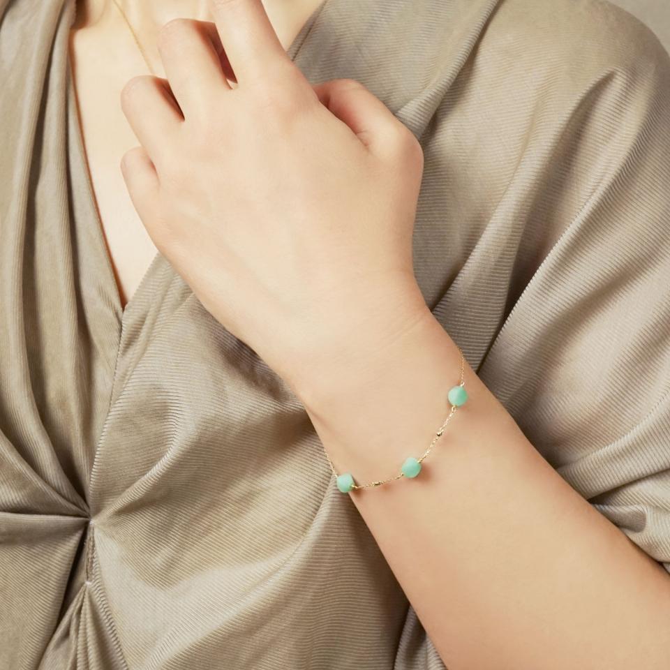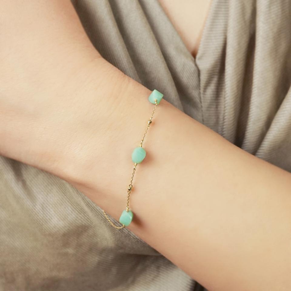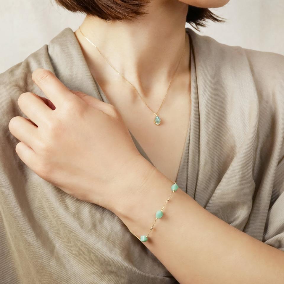 アマゾナイトの間に留めたイエローゴールドのパーツが太陽の反射にようなアクセントになり、手元に軽やかなリズム感を演出。